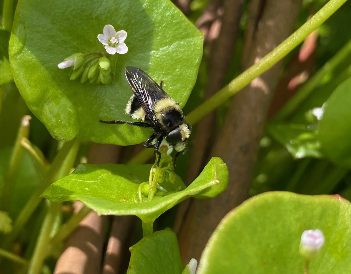 Is that a Black-tailed Bumble Bee on the flowers of Miner’s Lettuce? My curiosity is piqued as I have never seen bumble bees visit these tiny flowers. Closing in on the insect, I realize that I have been roundly duped. Those big eyes are a dead give-away that it’s not a bee, but a fly. It is a Bumble Bee Hoverfly, an uncanny imposter!