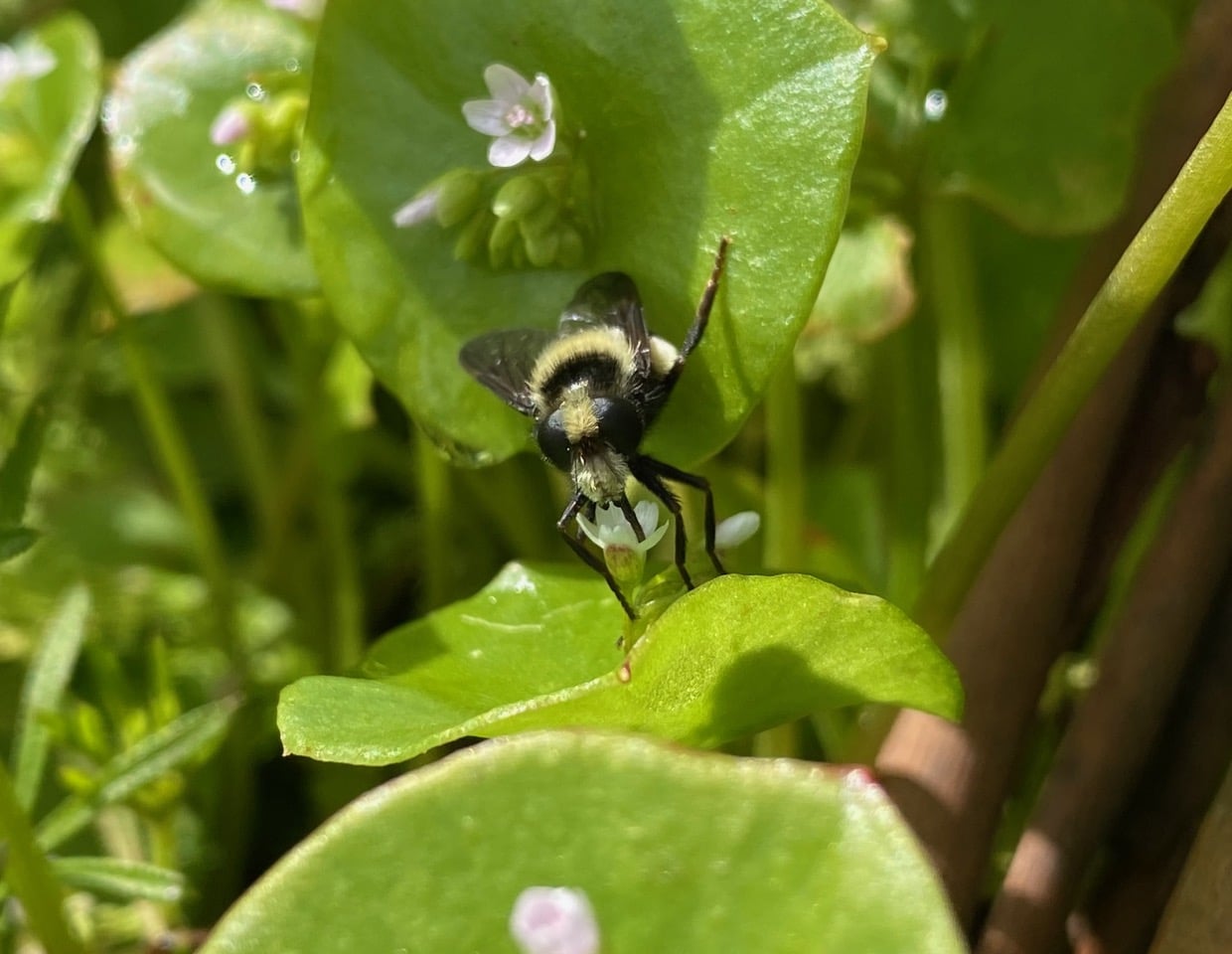 The hoverfly flies from one Miner’s Lettuce leaf to the next, always aiming its proboscis into the tiny flowers.
