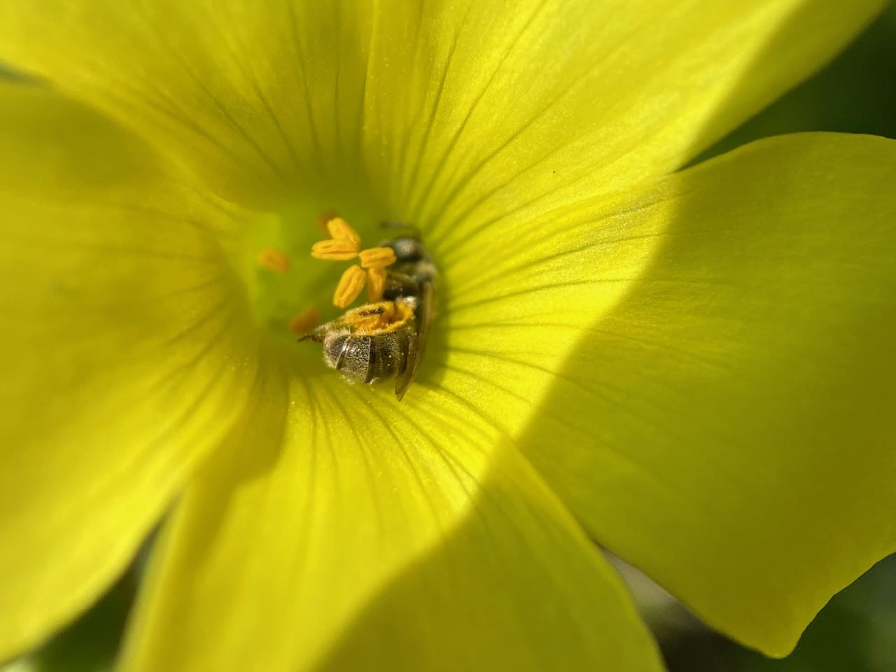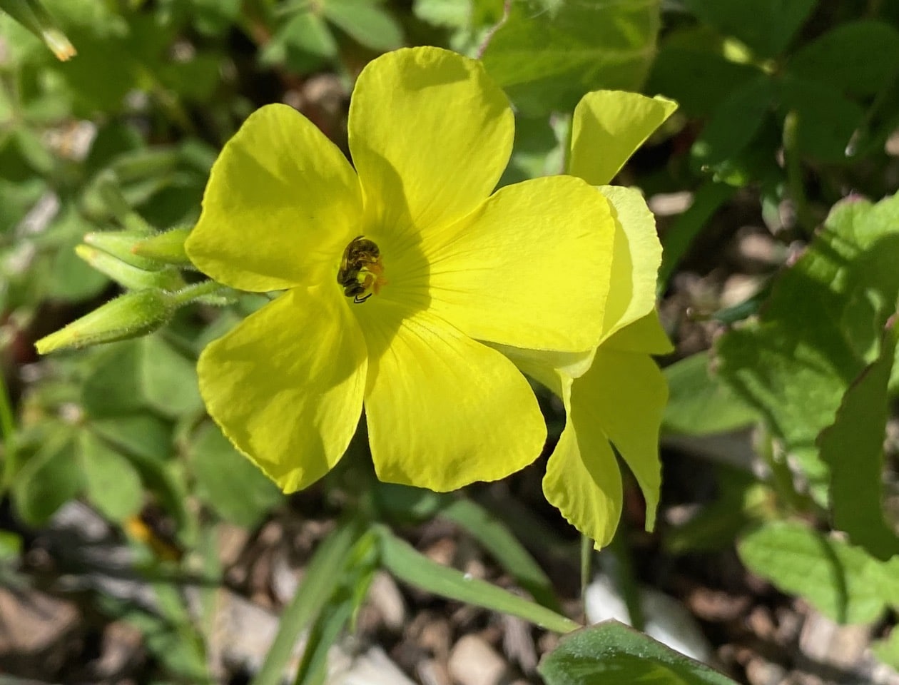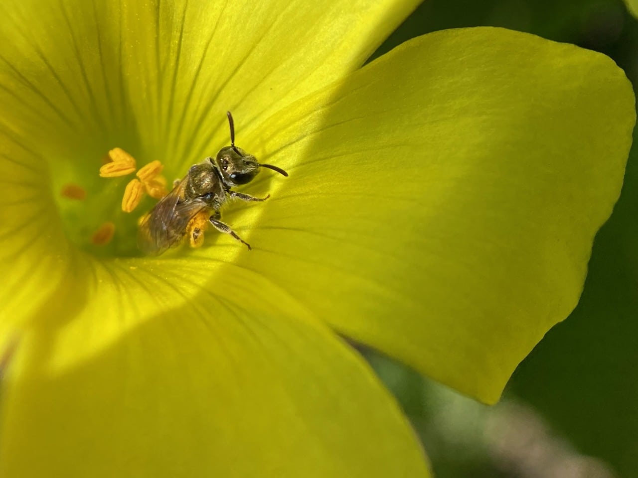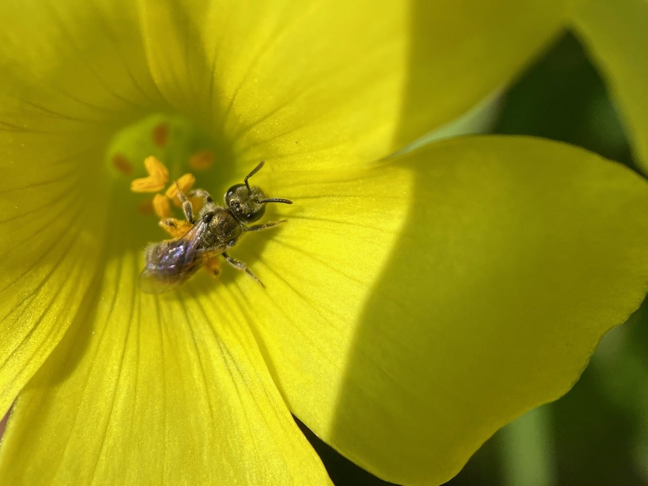 A tiny bee is collecting pollen in a Bermuda Buttercup flower.