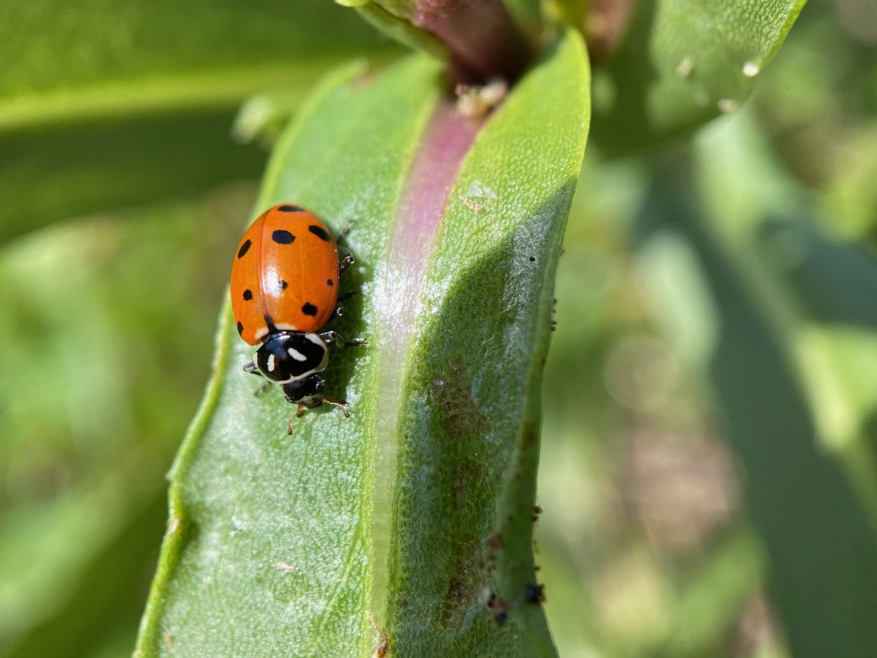A Convergent Lady Beetle, Hippodamia convergens (family Coccinellidae) is hunting on a Grindelia leaf. Both adult and larval lady beetles are voracious predators of aphids, and other soft-bodied invertebrates.