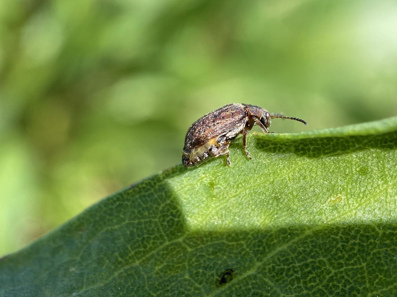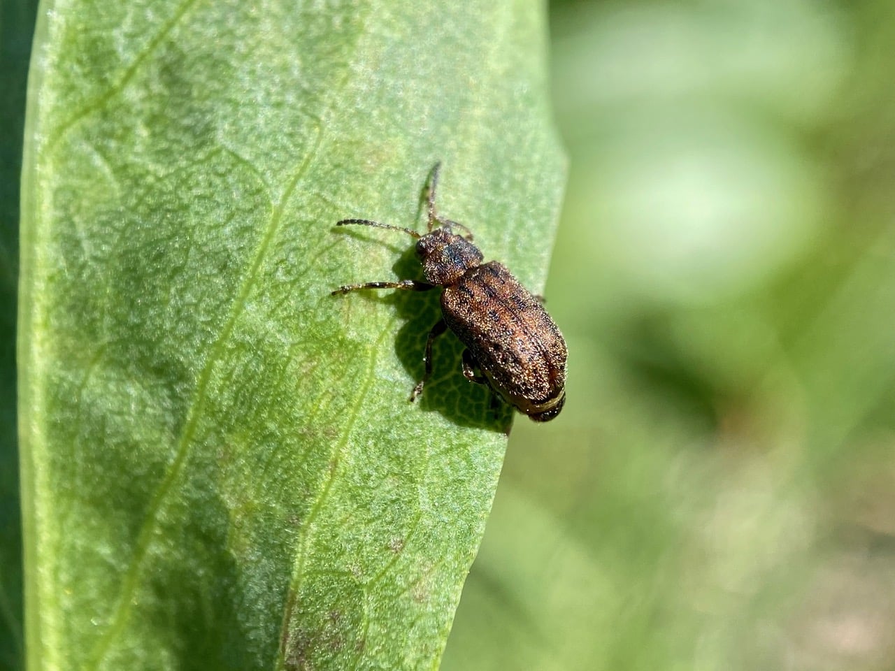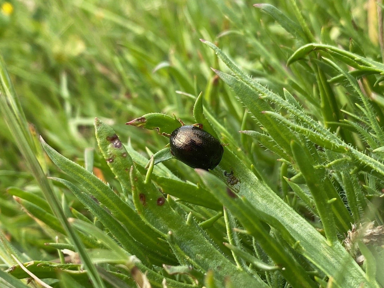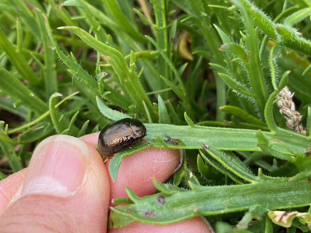 Here’s another Bronze Beetle, Chrysolina bankii (family Chrysomelidae) on a leaf of the non-native Buck’s Horn Plantain, Plantago coronopus.
