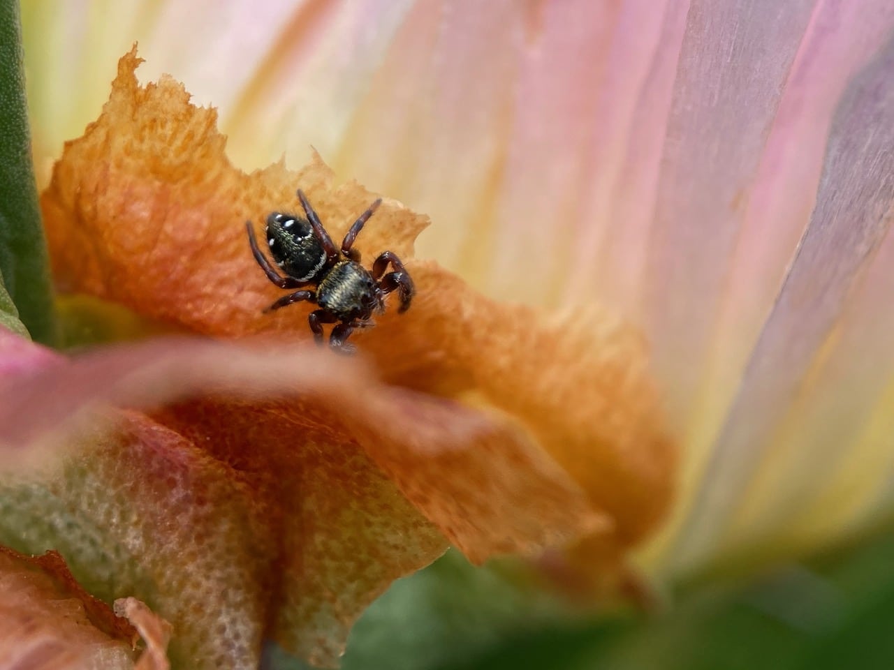 Ooh, another jumping spider on a withered Sea Fig flower. A jumping spider enthusiast on iNaturalist has helped identify it as the Brilliant Jumping Spider, Phidippus clarus (family Salticidae).