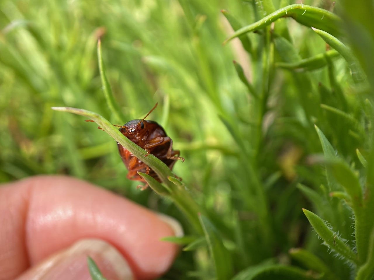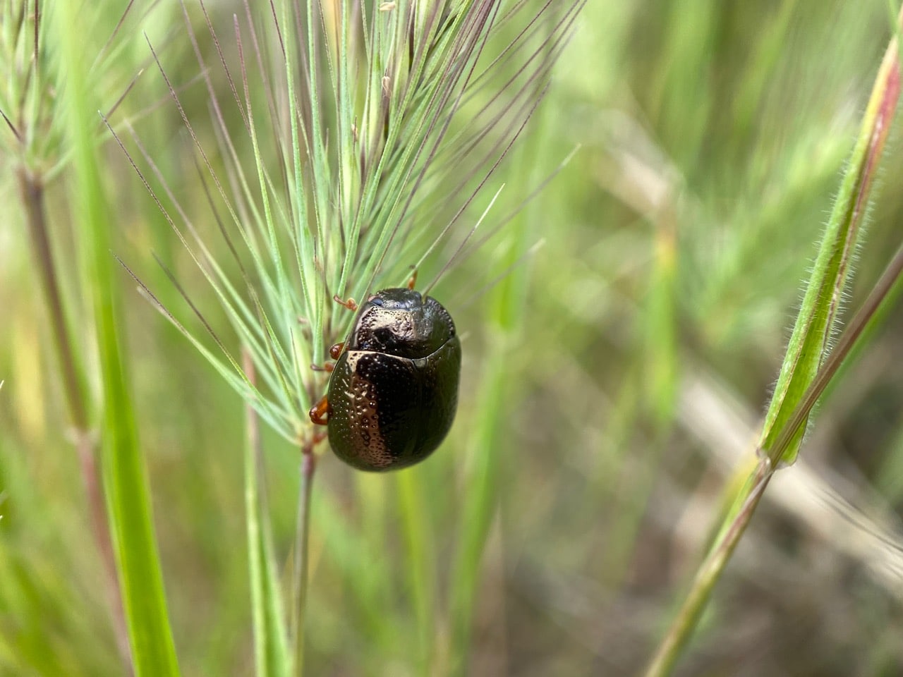 A Bronze Beetle is clinging to a foxtail grass, its head in a typical retracted position under its thorax. The beetles seem widespread on this stretch of the Alameda shoreline.
