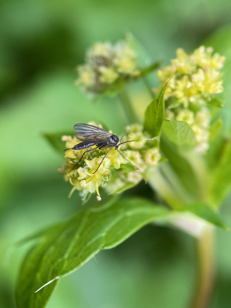A gnat lands on a cluster of Pacific Sanicle flowers, Sanicula crassicaulis. It belongs to the superfamily Sciaroidea that includes the Fungus Gnats and Gall Midges.