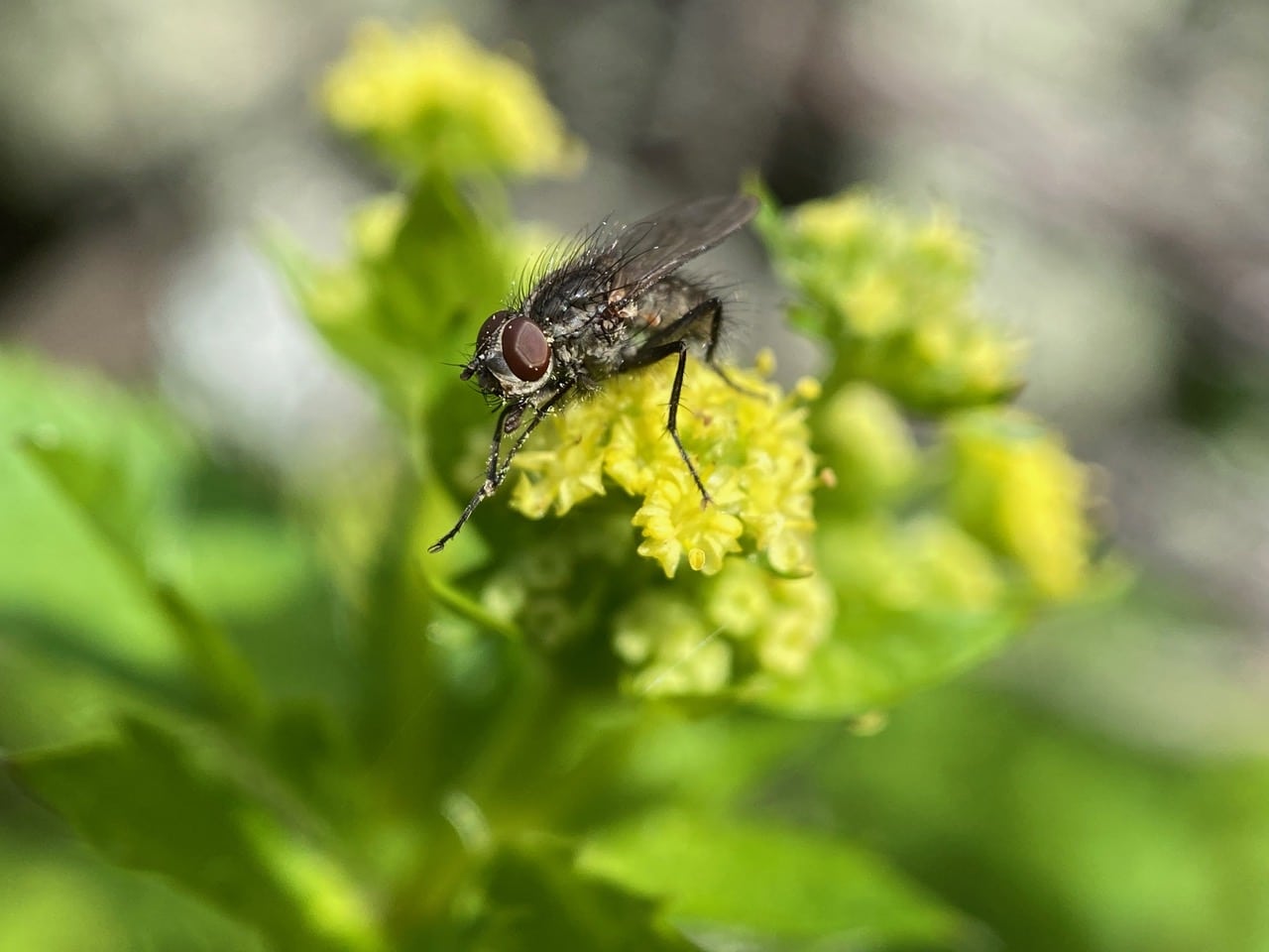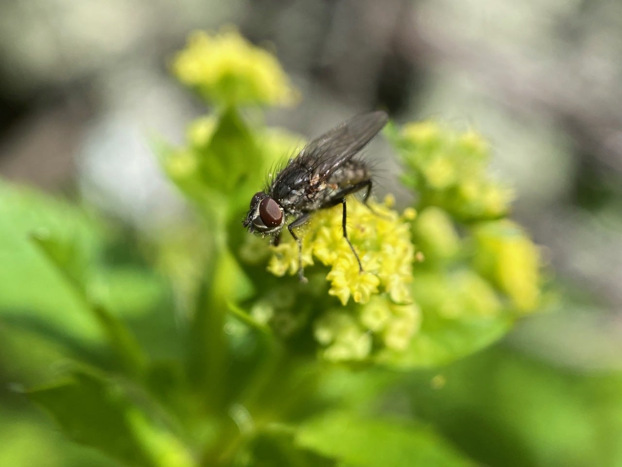 A glossy black fly has landed on a cluster of flowers on a Pacific Sanicle.