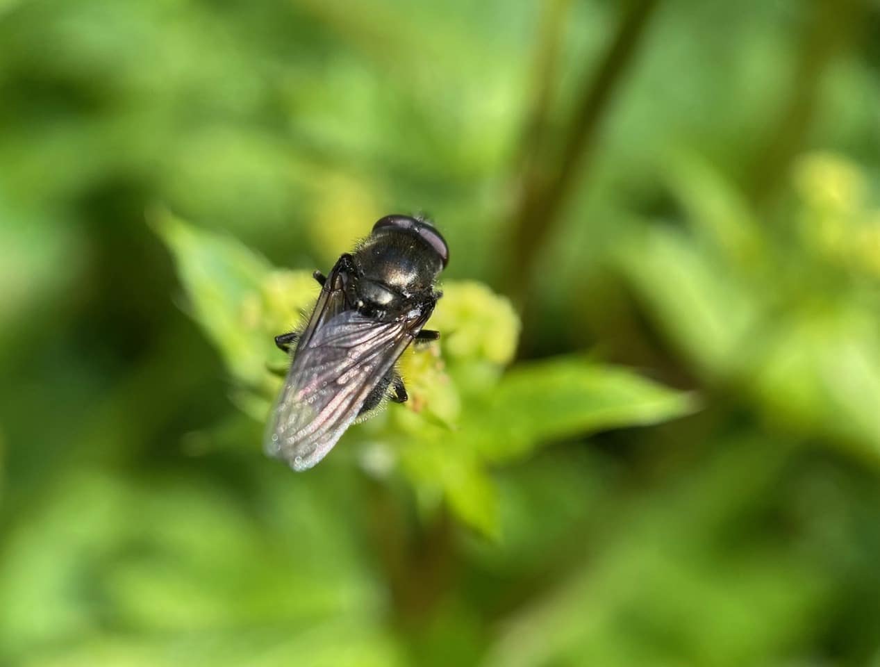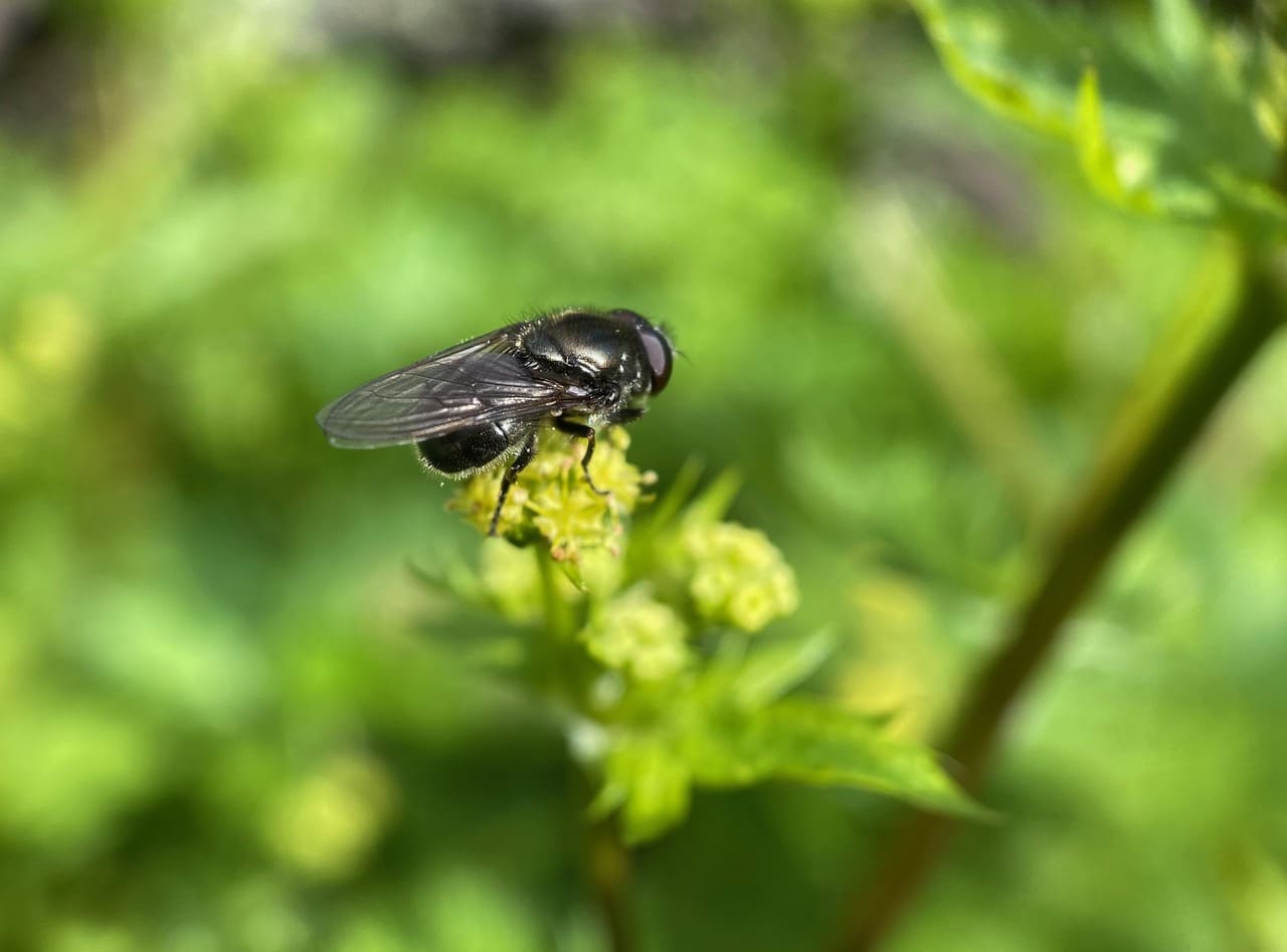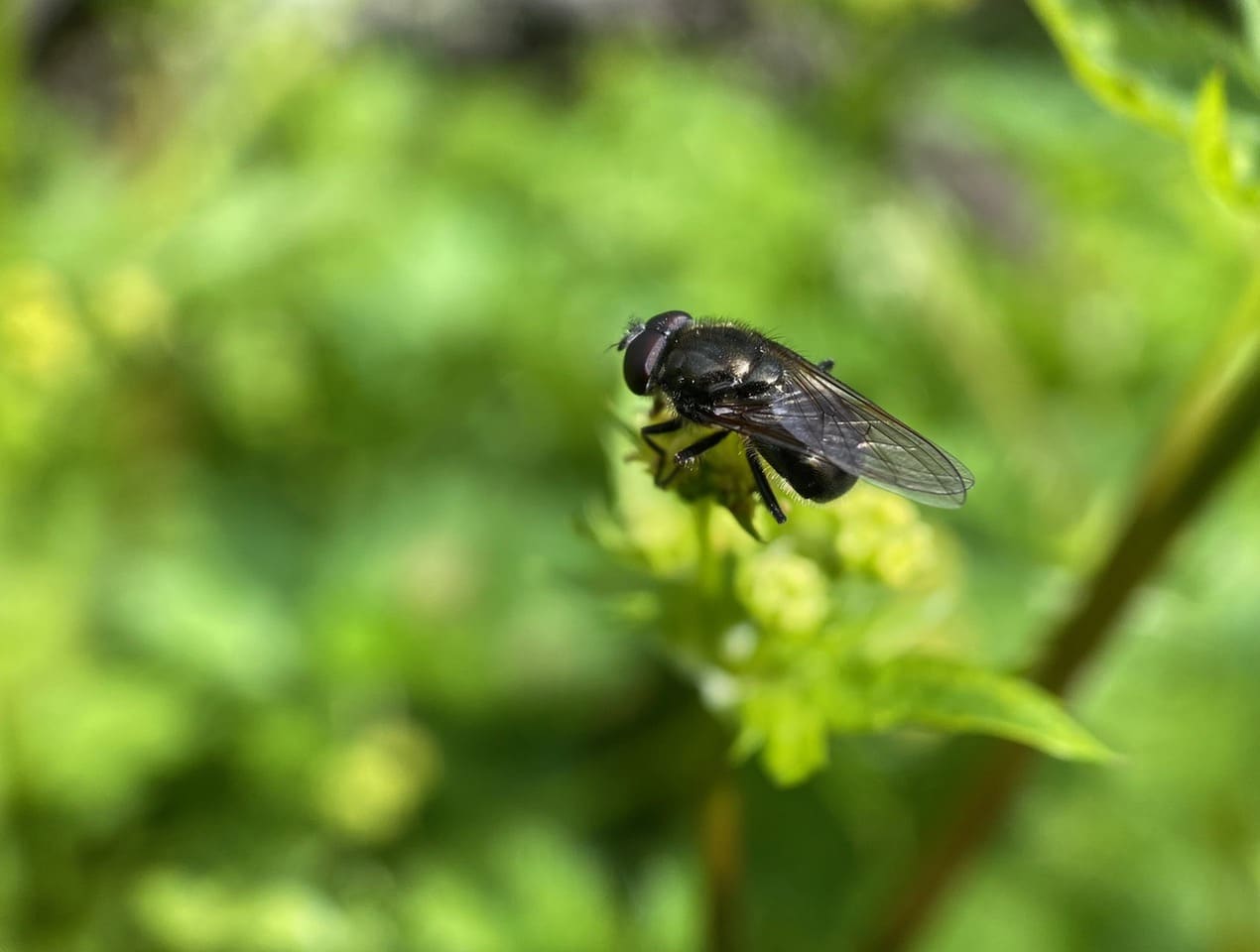 It is an unusual hoverfly that eschews the yellow-and-black color scheme of most Syrpids – the Blacklet, Cheilosia sp. (family Syrphidae).