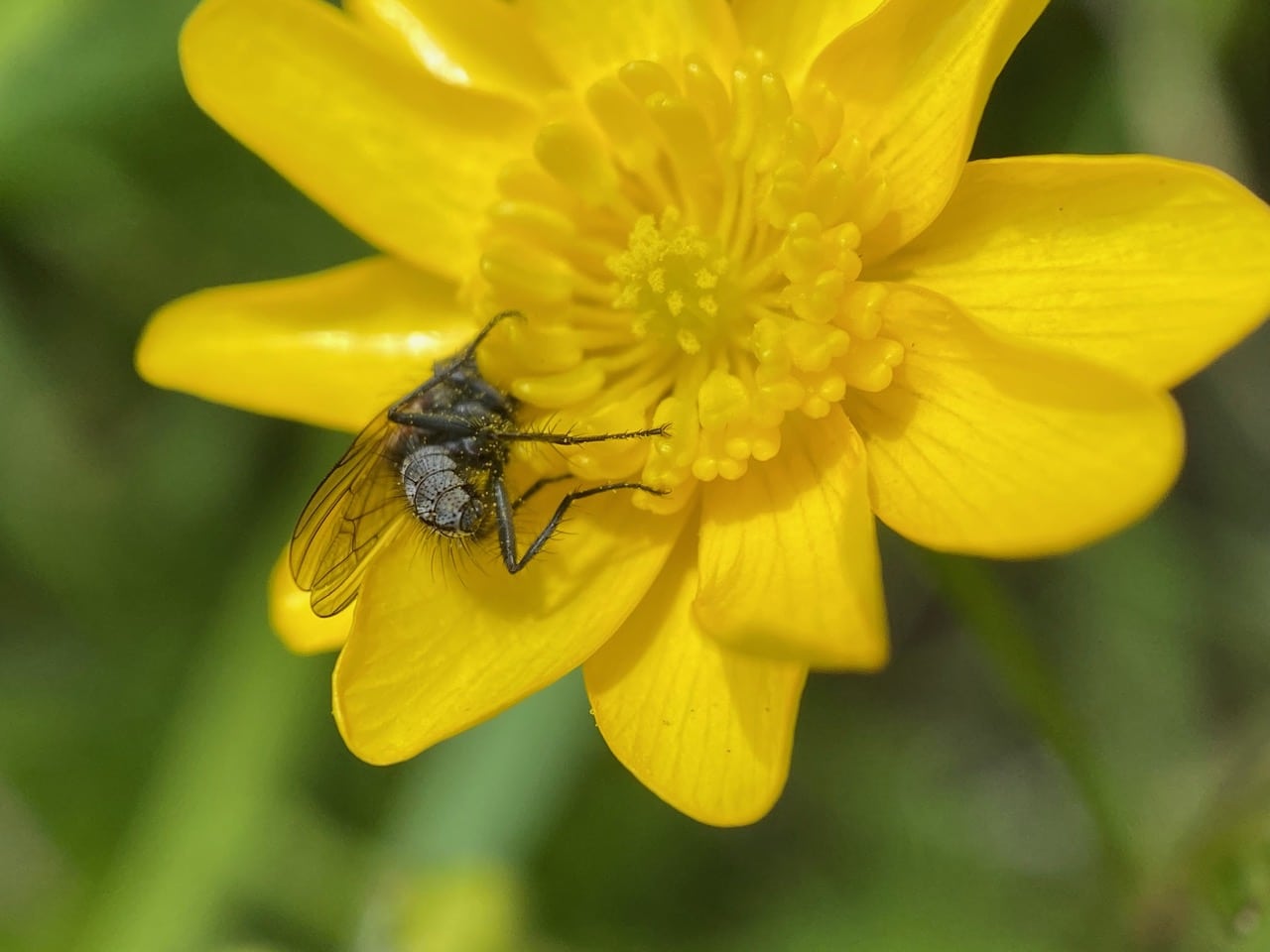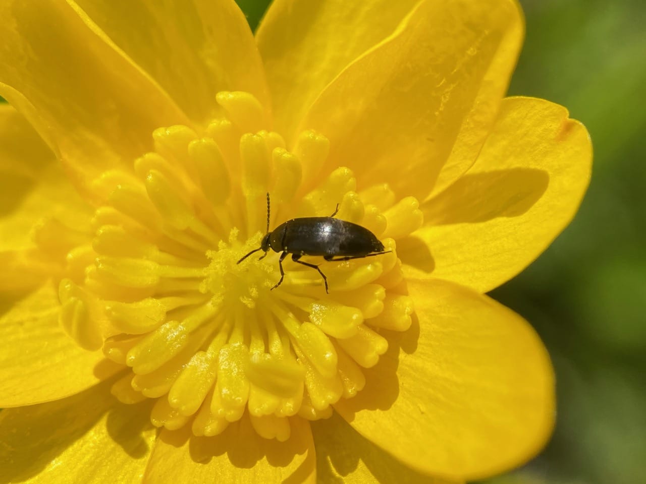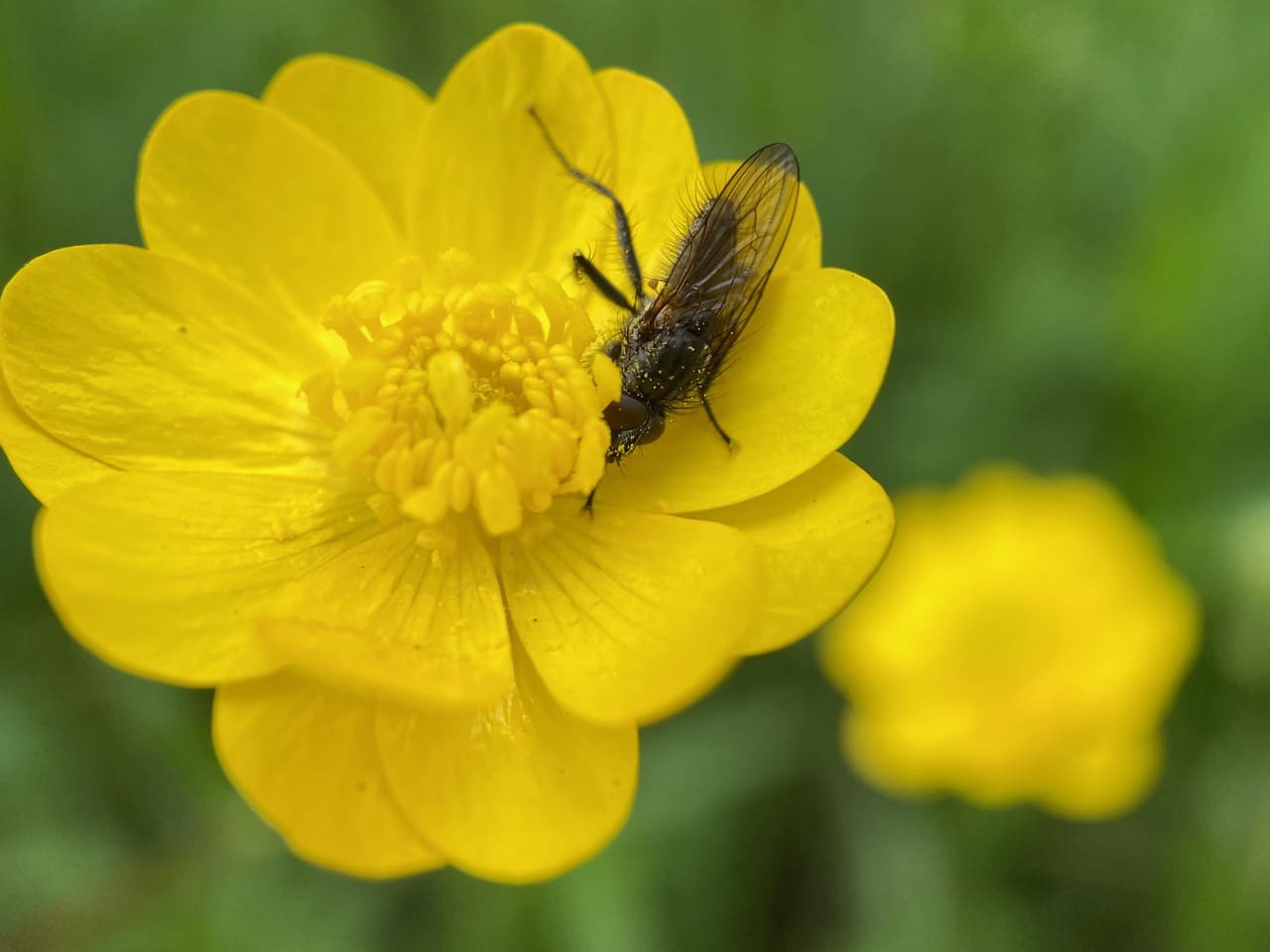 It is fun to watch insects seek nectar on the buttercup flower. Often they make a full circle around the perimeter of the flower, sometimes lying on their sides, probing the base of the petals one at a time.