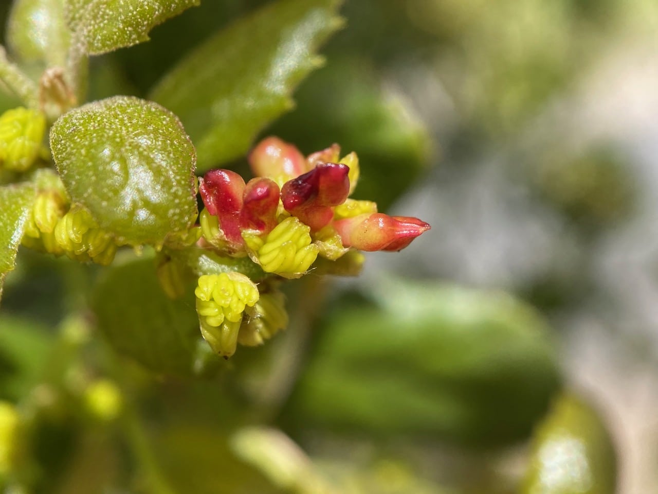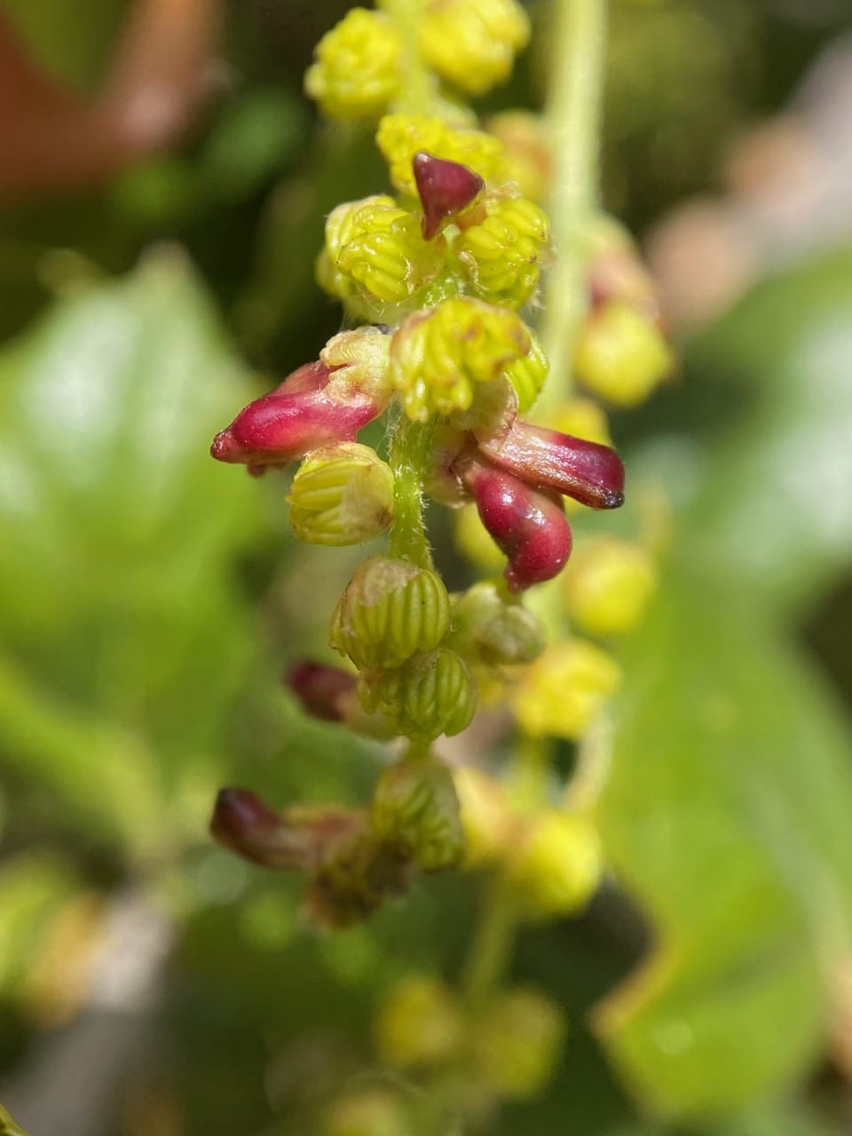 The Coast Live Oak, Quercus agrifolia is monoecious, with separate male and female flowers borne on the same tree. Male flowers are found on 2-4 inch long, drooping, yellow-green catkins, while the female flowers are inconspicuous reddish-green spikes in the leaf axils. The flowers are wind-pollinated, relying on the wind to carry pollen from the male catkins to the female flowers.