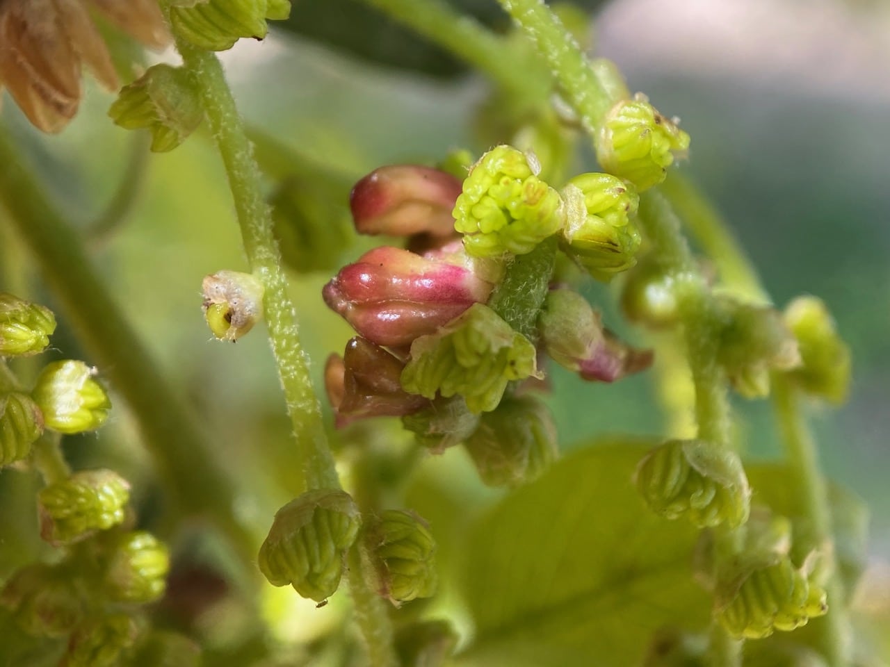 Some reddish succulent structures can be seen among the immature flowers of a distorted male catkin. Note that the male flowers are without any petals, each comprised of tightly packed stamens.