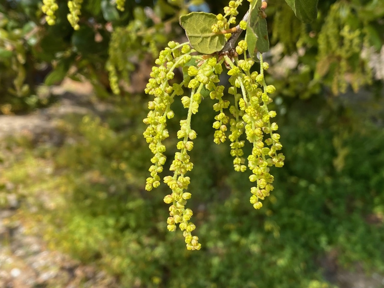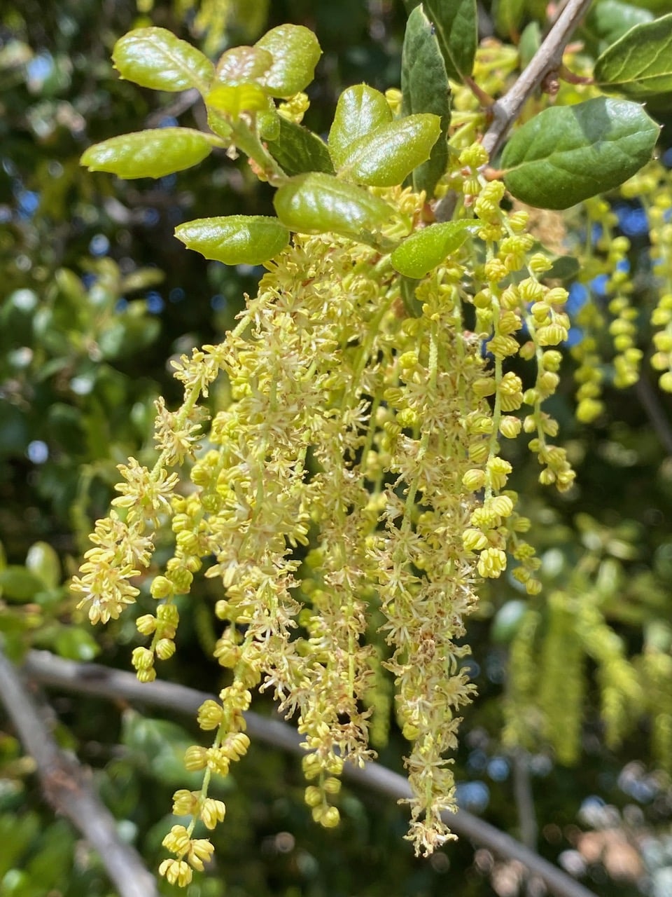 A small Coast Live Oak with low-hanging branches provides me the perfect opportunity to examine its pendant male catkins.