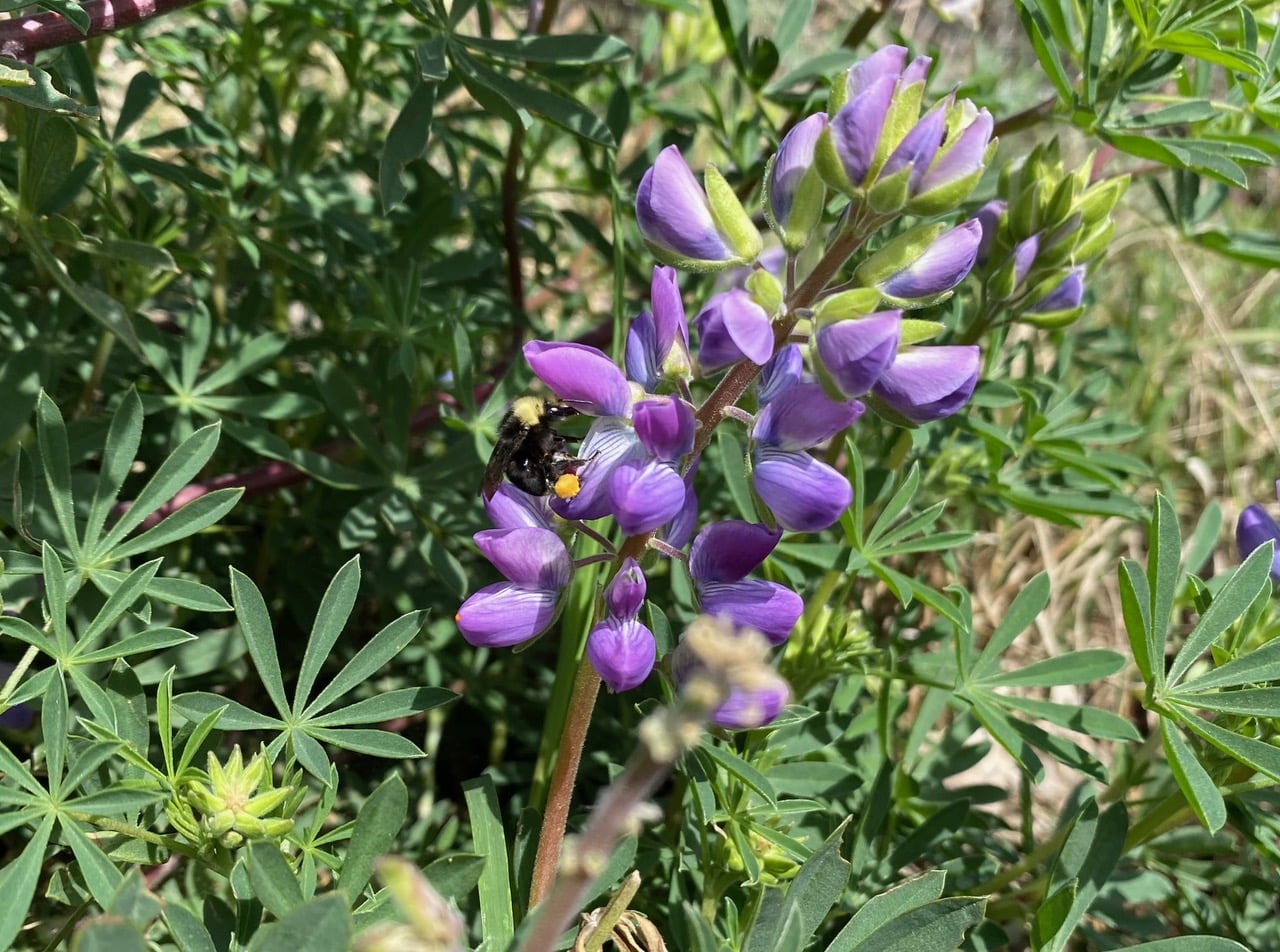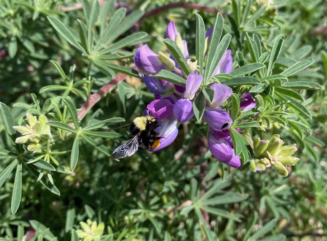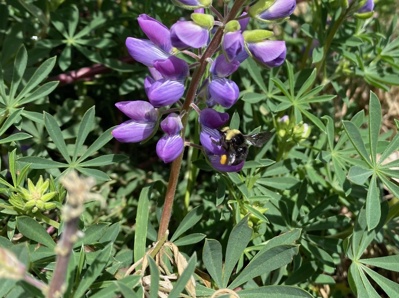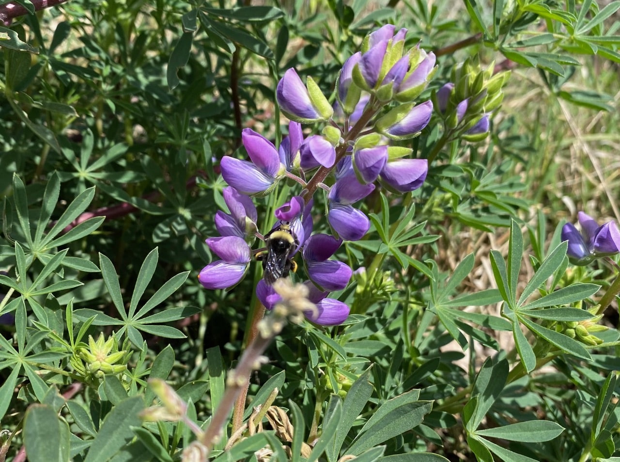 In this garden, most of the insects visiting the lupines are the bumble bees. Other heavy-bodied bees are capable of this feat, such as the Digger Bees, Anthophora sp. (family Apidae), but so far I have not seen them on the lupines here.