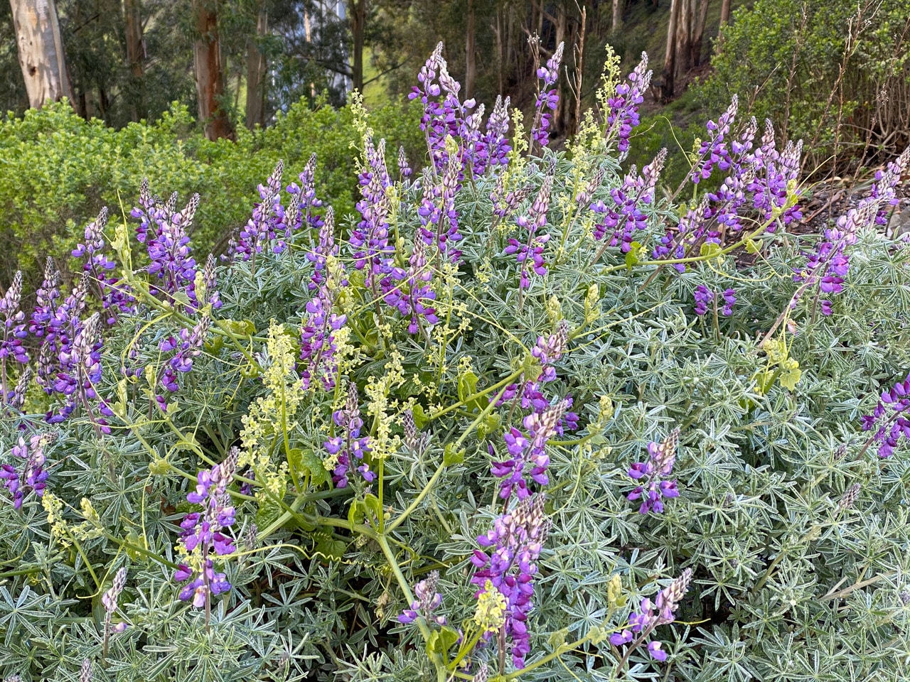The latest outpour of the atmospheric river has drenched Skyline Garden. At Siesta Gate, sections of Grizzly Peak Blvd has water running on the surface. The Silverleaf Lupine, Lupinus albifrons is still covered with rain drops as I make my way uphill on this dry but cold morning.