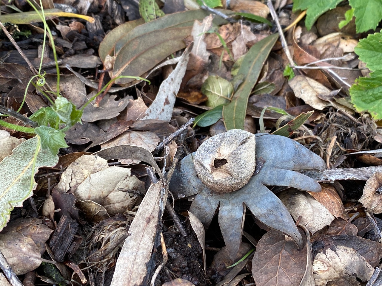 Among the leaf litter under a familiar oak tree I look for the Earthstar fungus. Sure enough, there’s plenty of them, all spent. The latest round of heavy rains must have been a major spore dispersal event for these unusual fungi. Here’s one with a partially deflated spore sac still on its star-shaped pedestal.