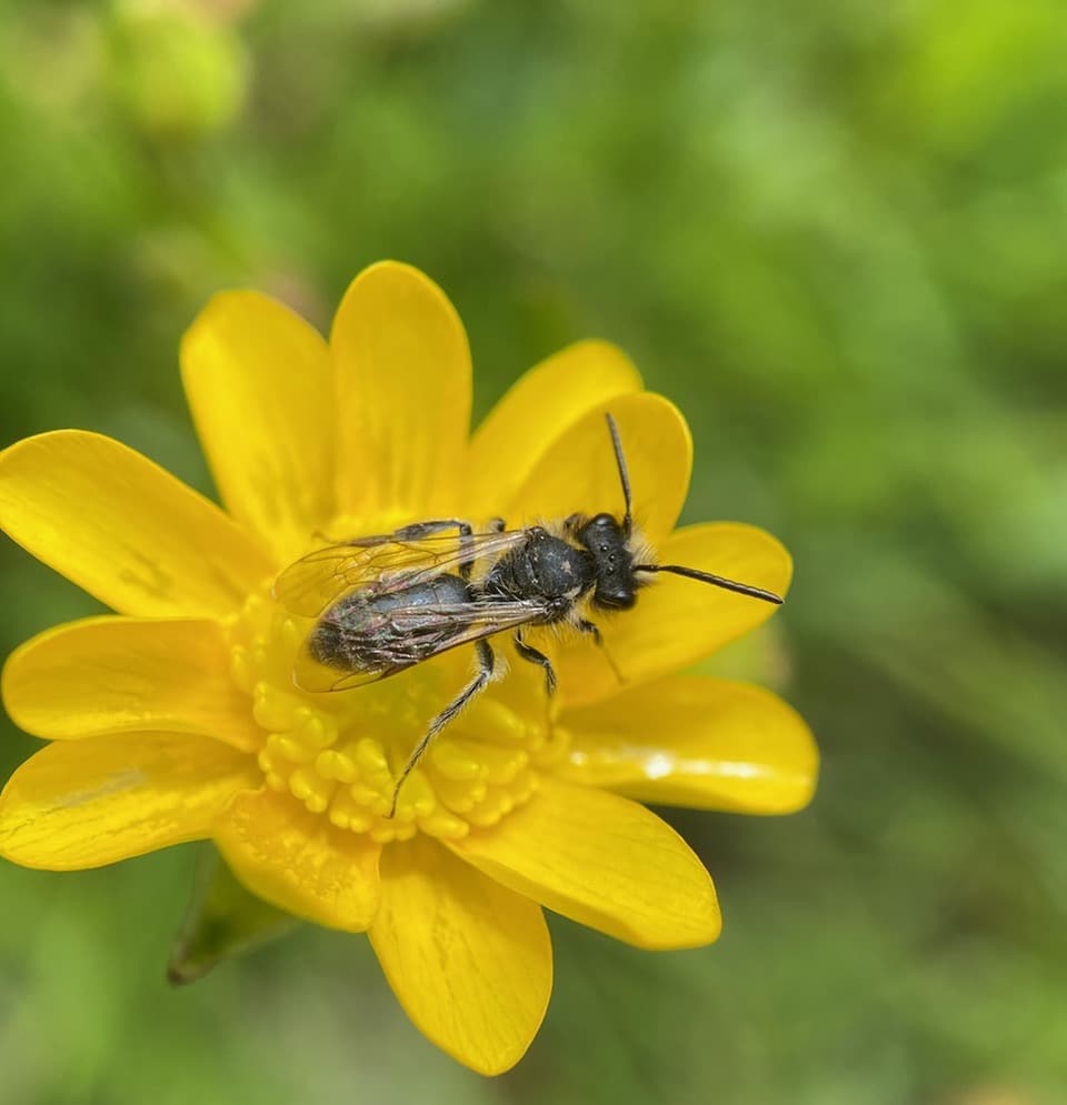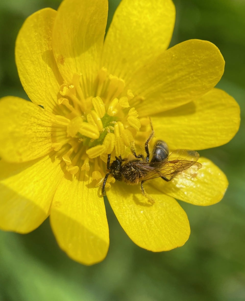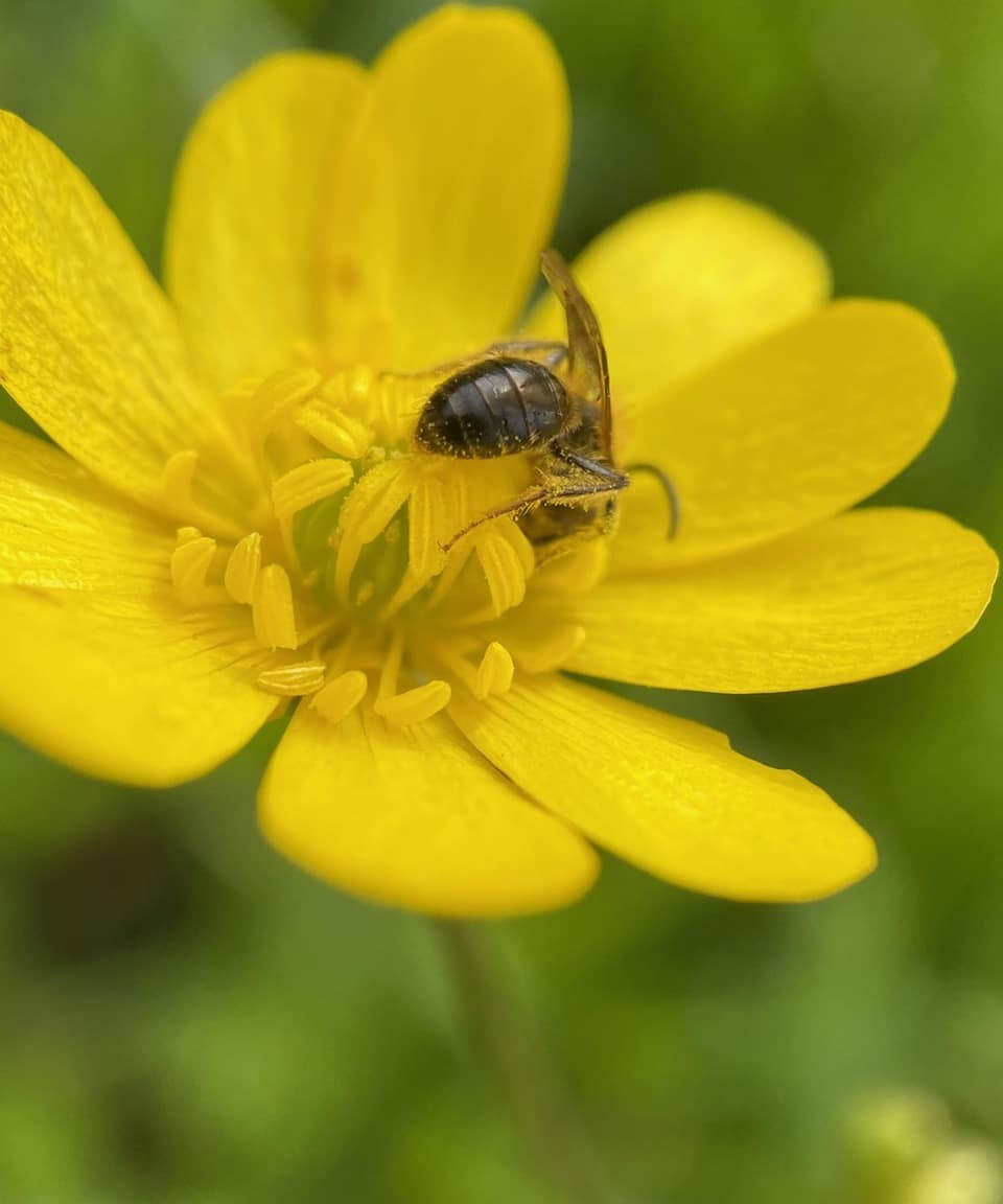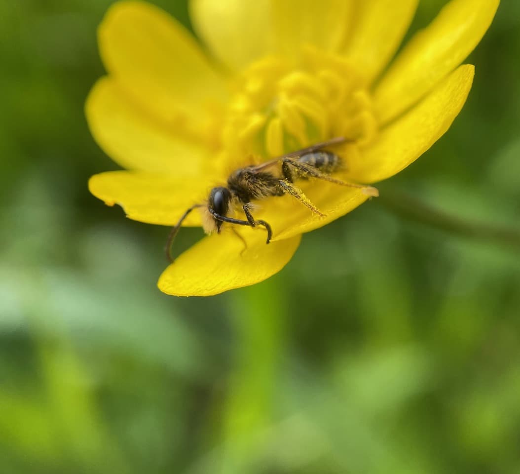 It is convenient for the male bees to sleep on their favorite forage plant, as the they can meet the females and mate with them when they come foraging. On top of that, they can have breakfast in bed! The Buttercup flower is the male Mining Bees’ B&B.
