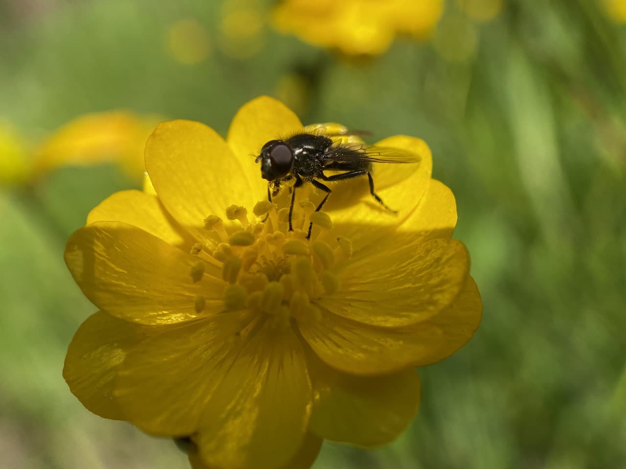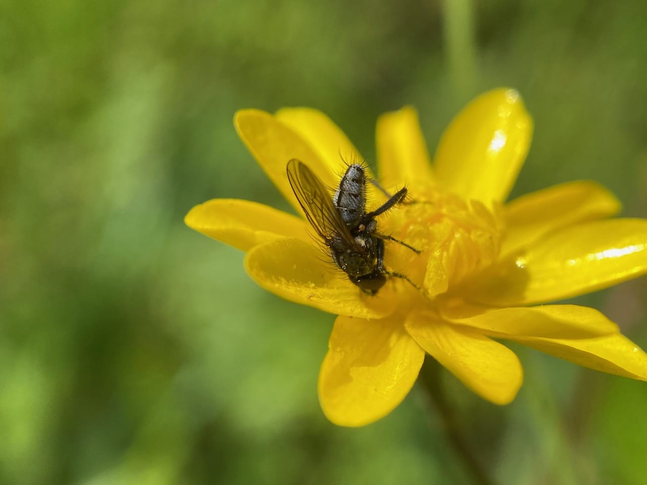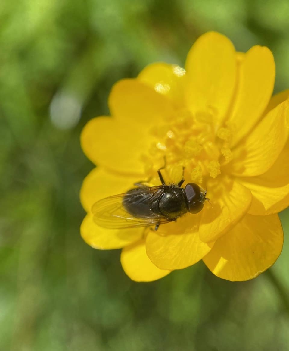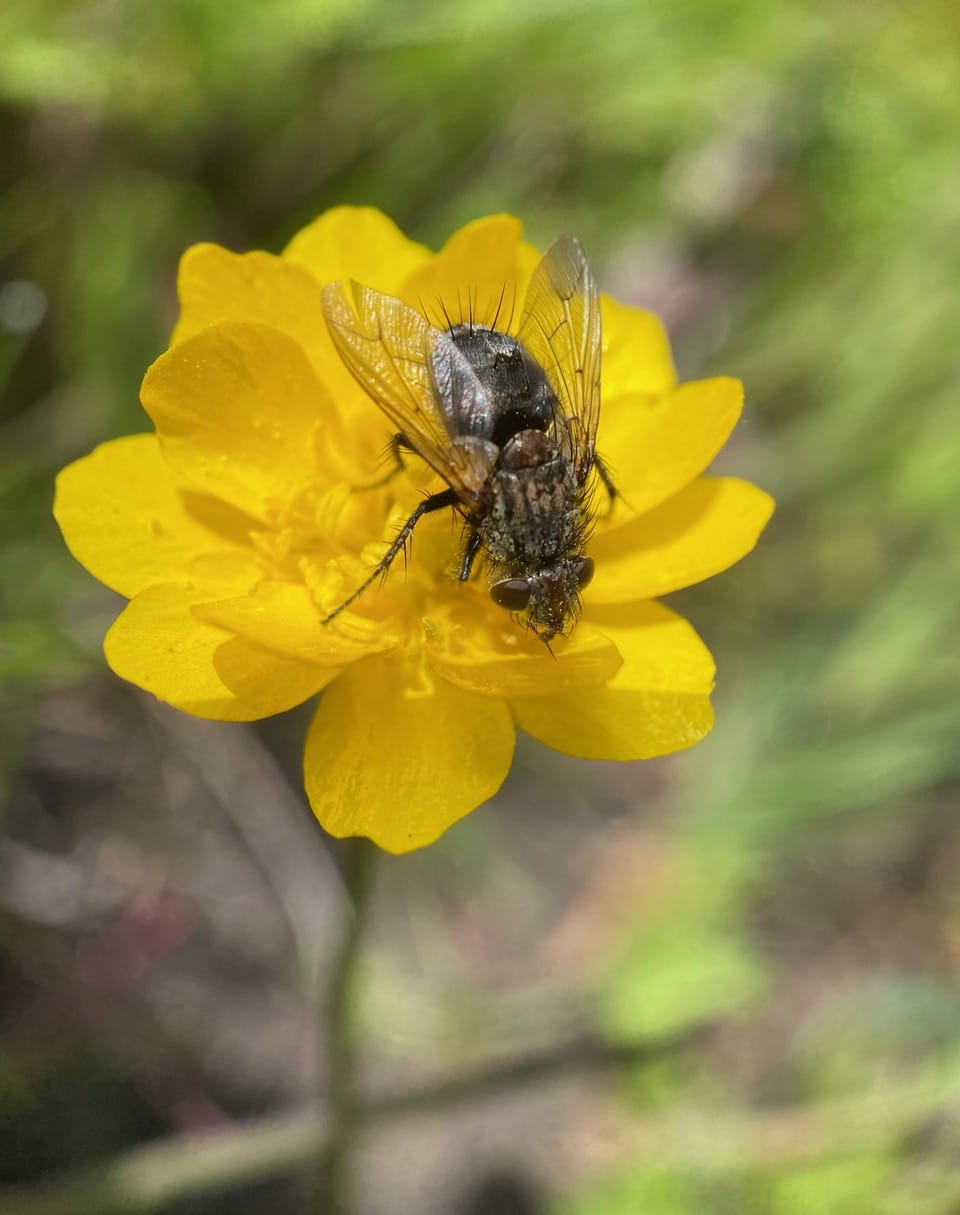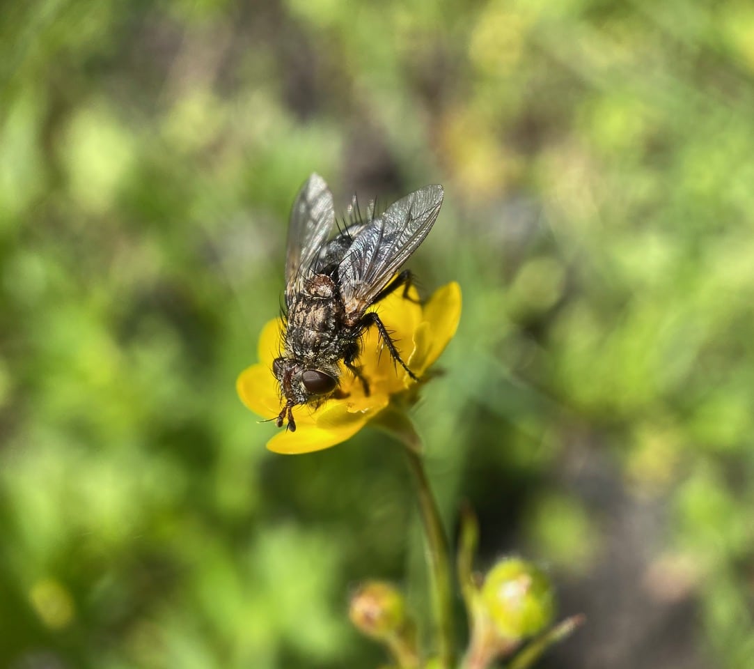 A bristly, robust fly lands on a Buttercup flower. It is a Bristle Fly (family Tachinidae)!
