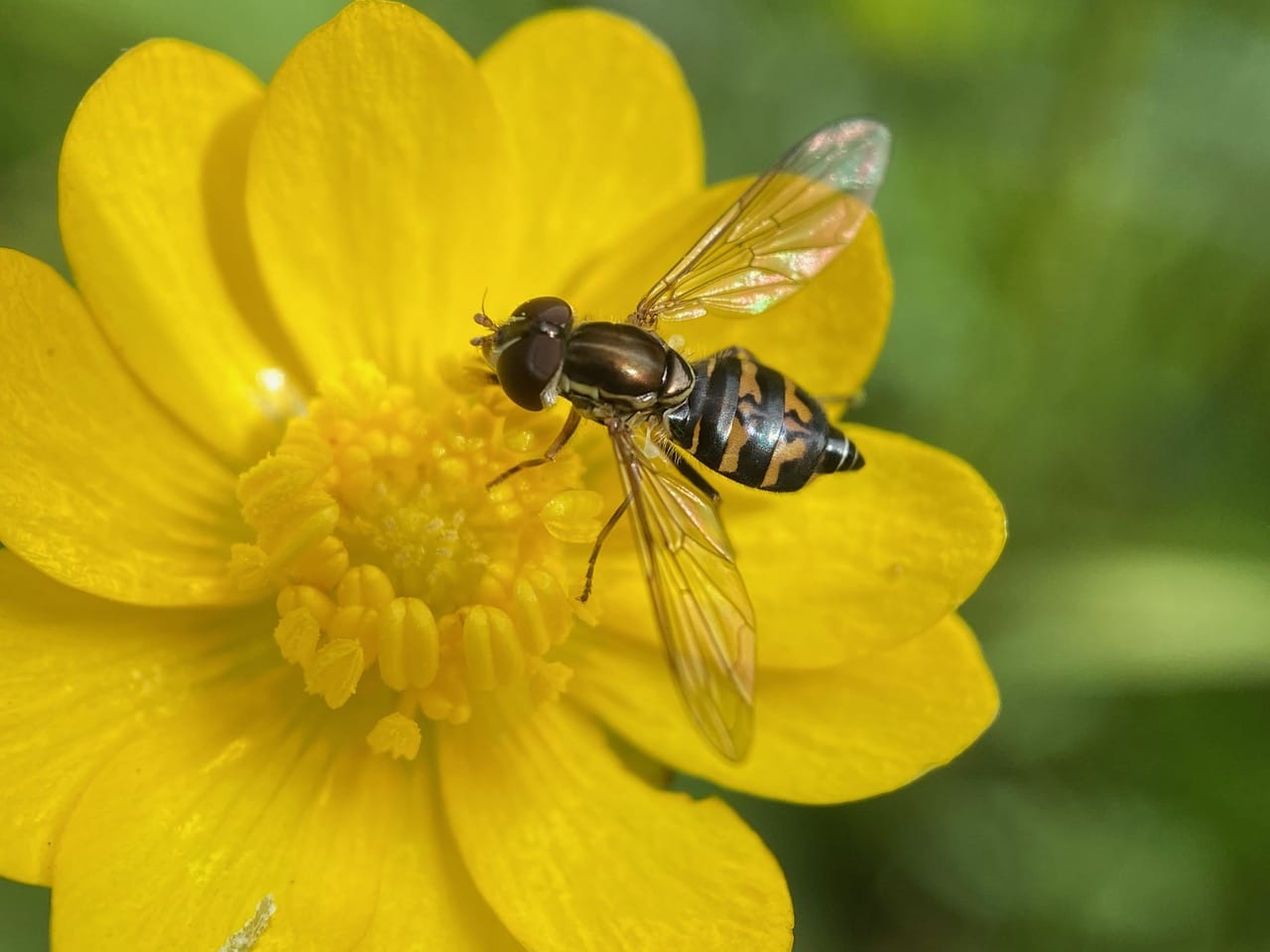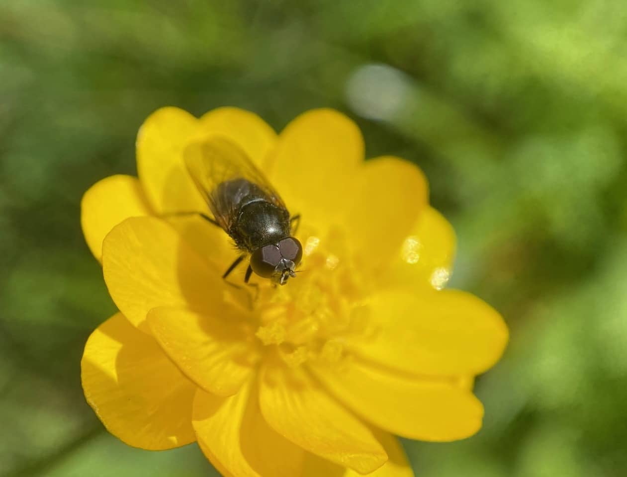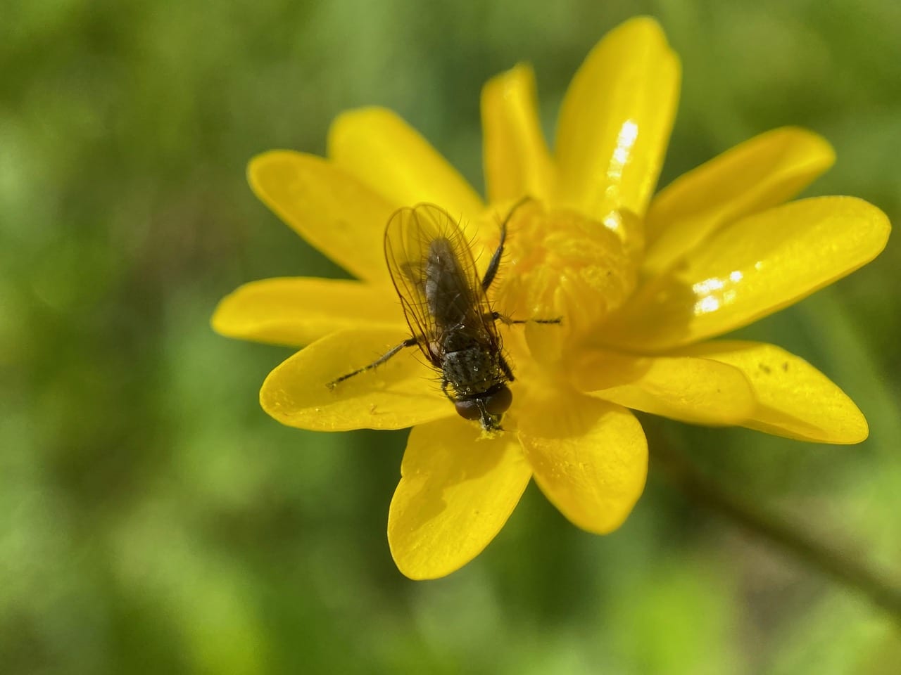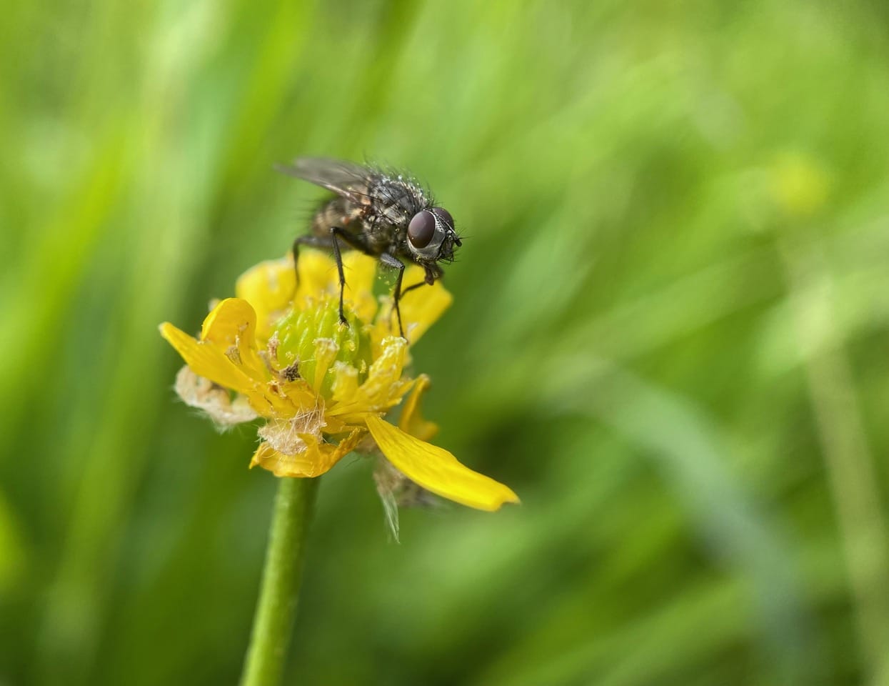 A bristly, robust fly lands on a Buttercup flower. It is a Bristle Fly (family Tachinidae)!