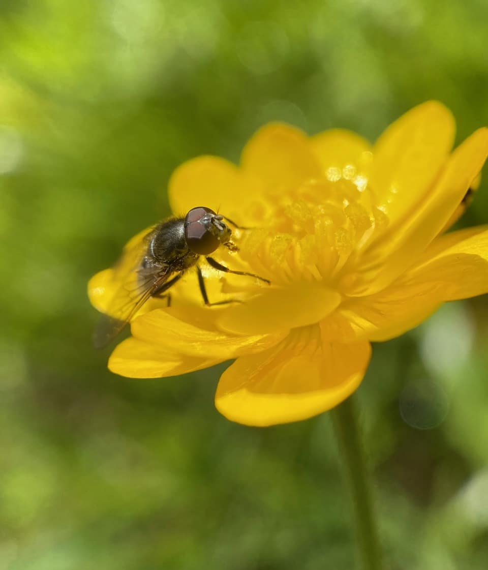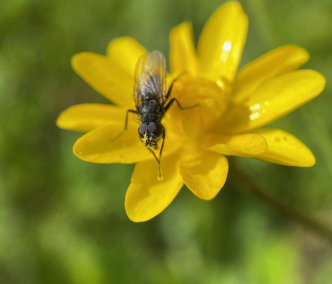 The fly emerges, its face mired with sticky pollen from the Buttercup flower it has just sampled.