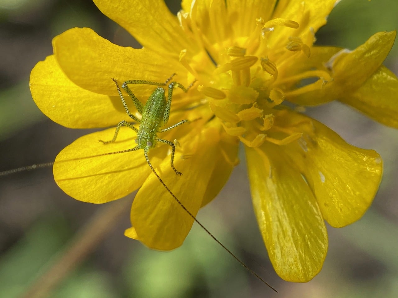 Now I know who has been chewing on the petals of the California Buttercups in this patch – a small Katydid nymph!