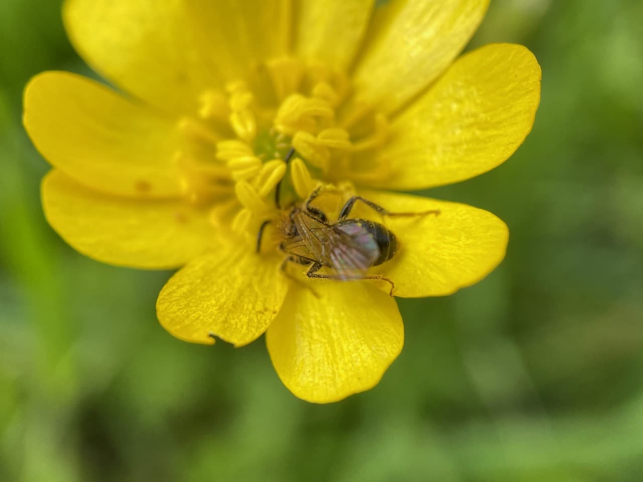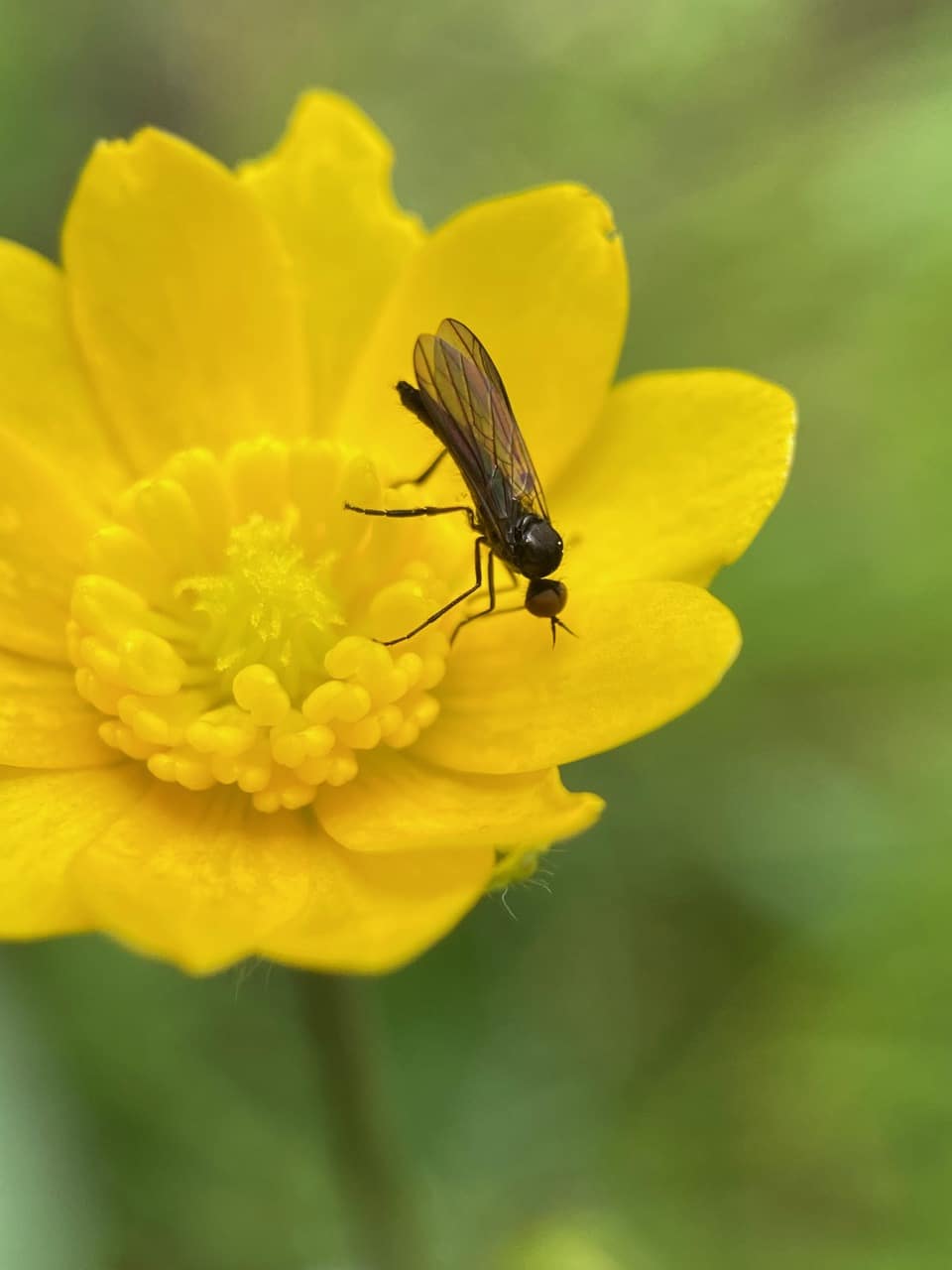 A Balloon or Dance Fly (family Empididae) is foraging on a fresh buttercup flower.
