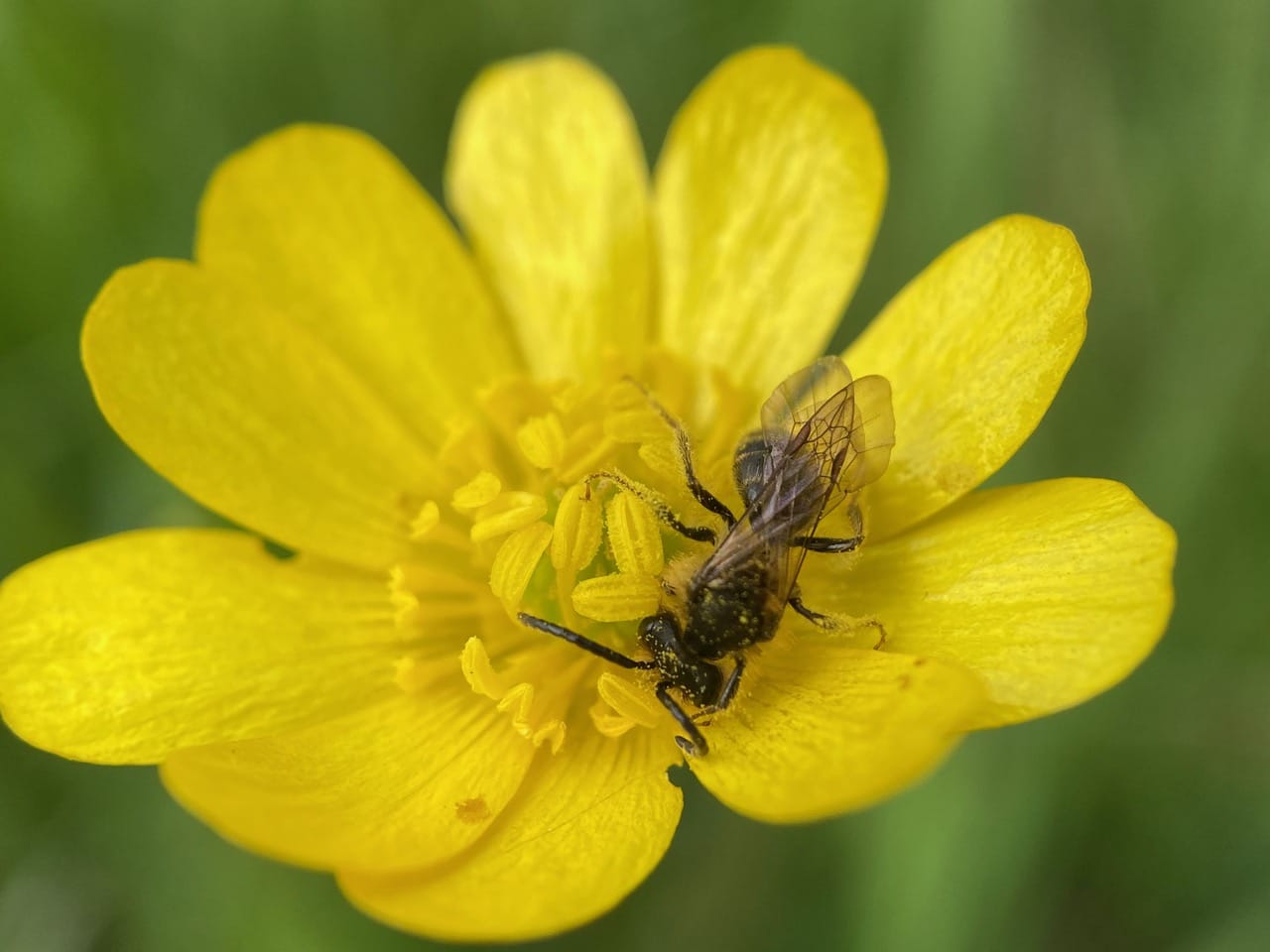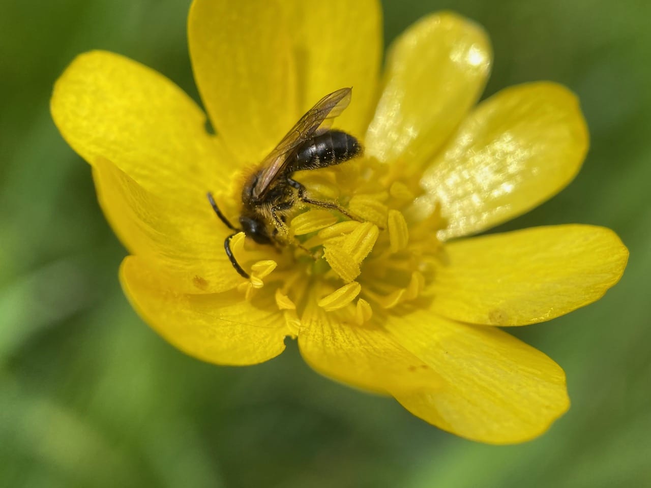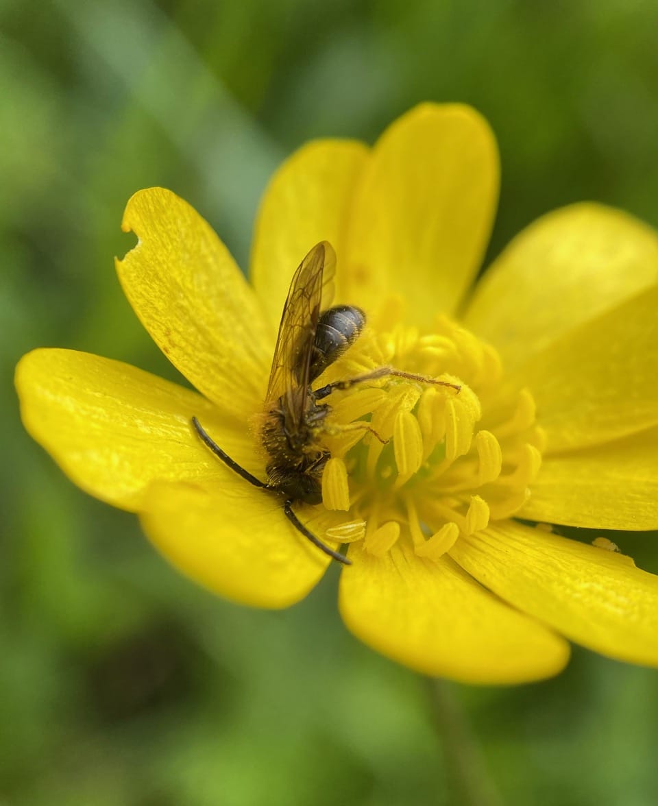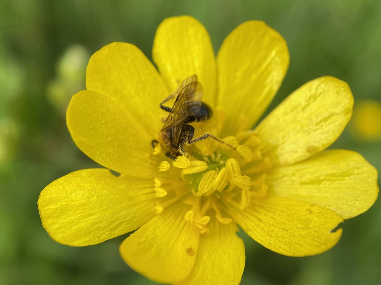 Hey, here’s another male Andrena on a buttercup flower. He is not the same individual I have been photographing, as Sleepy Head is still feeding on his own flower.