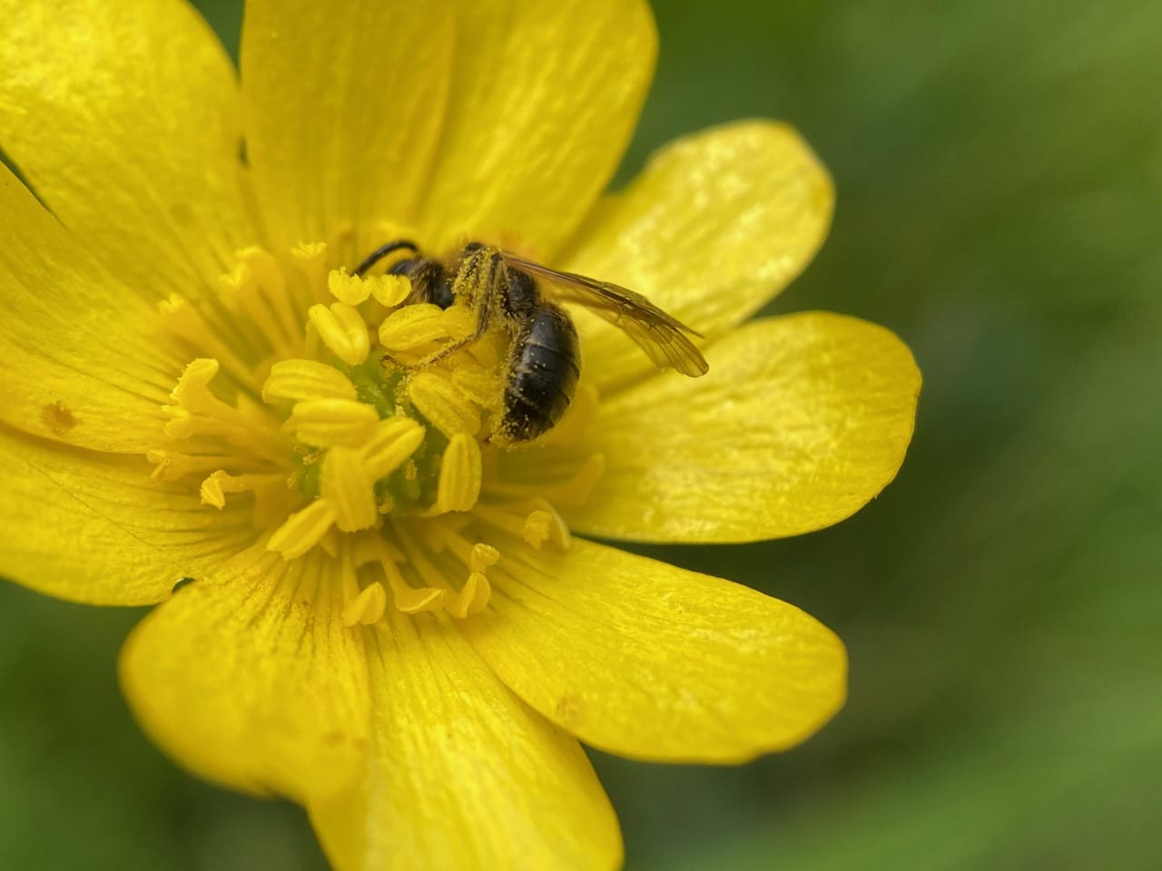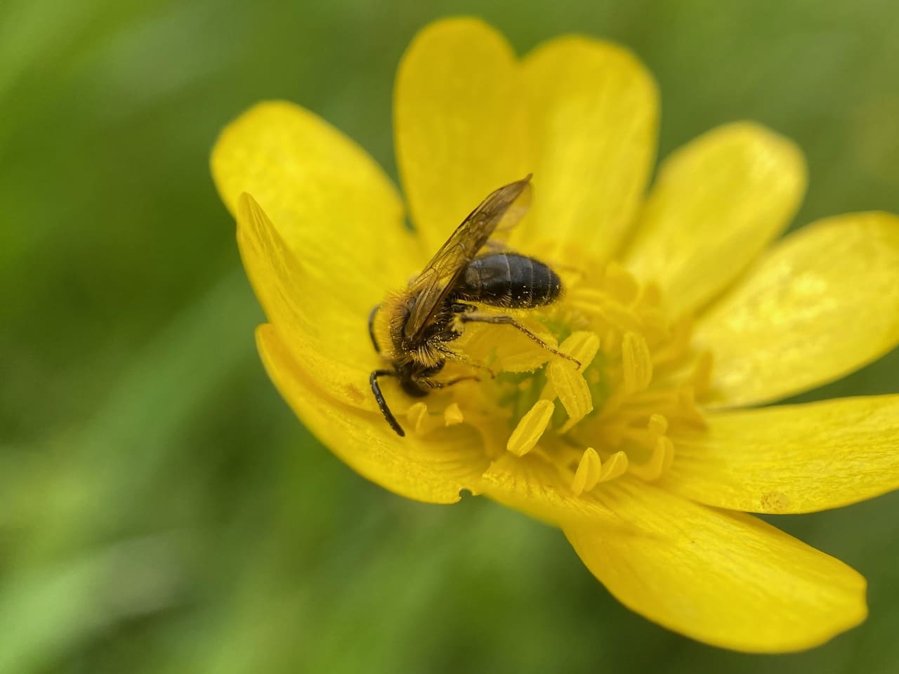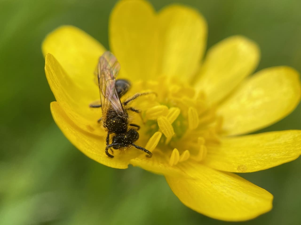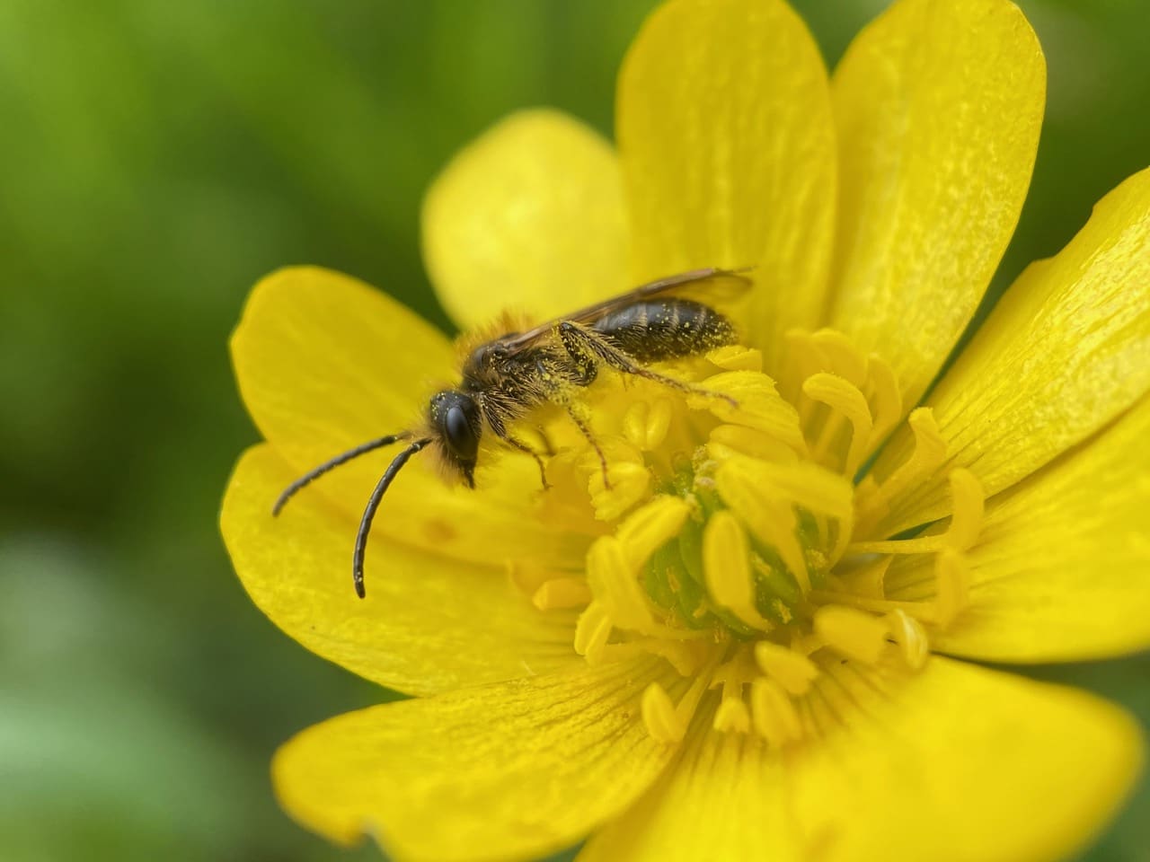 Hey, here’s another male Andrena on a buttercup flower. He is not the same individual I have been photographing, as Sleepy Head is still feeding on his own flower.