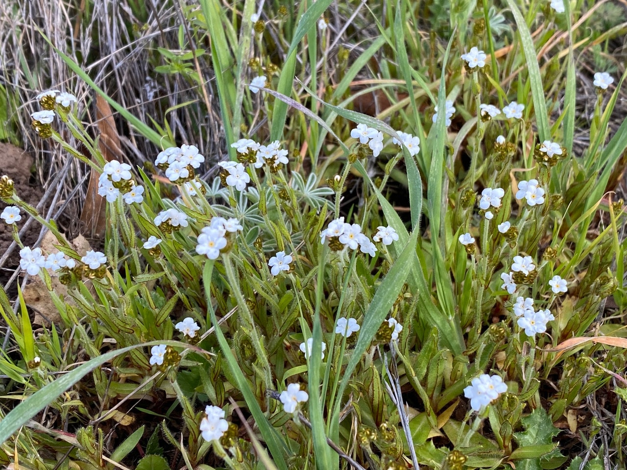 An annual herb, Rusty Popcornflowers, Plagiobothrys nothofulvus (family Boraginaceae) has started to bloom among the grasses at Diablo Bend.