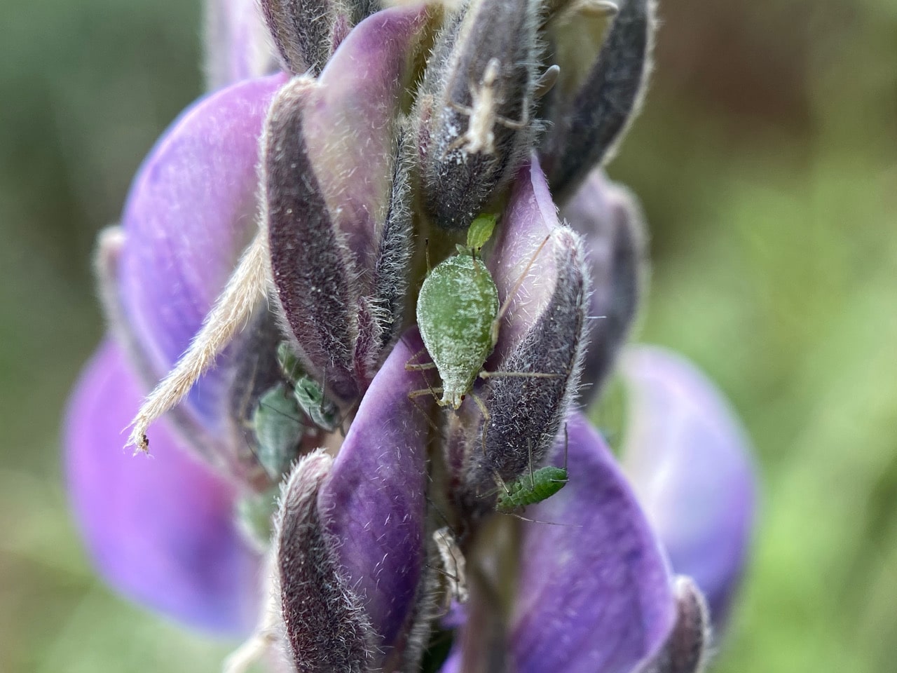 I check the plant on which I have previously found a new colony of Lupin Aphids, Macrosiphum albifrons. The infestation appears to have remained small and limited in scope. I guess these sunless days are hard on most insects, even aphids. I examine the neighboring lupines and can’t find any aphids on them. The infestation has not spread, as the aphids are relatively sedentary at this stage of their life. It’s only later when overcrowding occurs and predators and parasites abound that the aphids will send off alates (winged reproductives) to seek new territories.
