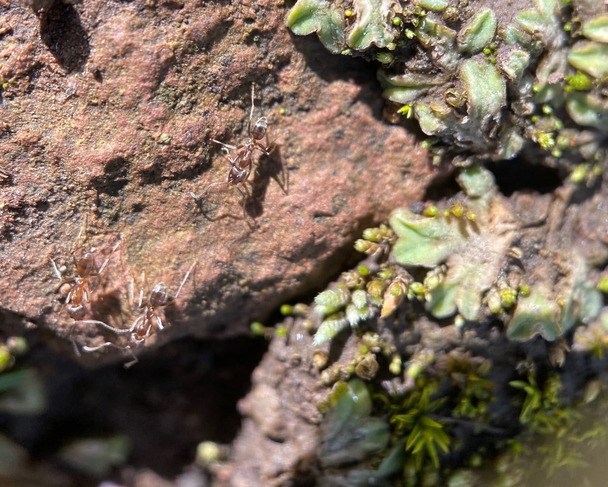 Almost invisible to the naked eye, Argentine Ants are foraging among the mosses and liverworts.