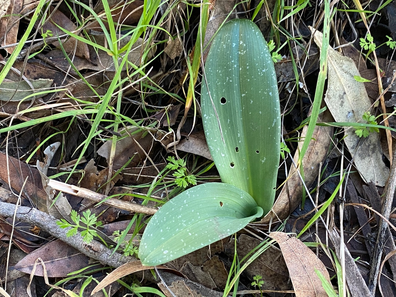 Basal leaves of the Elegant Rein Orchid, Piperia elegans? I remember seeing a spike of flowers here last year.