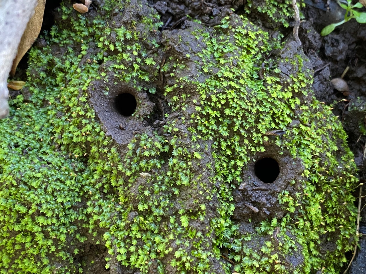 The mud banks along the Bay-Eucalyptus grove are greening up with mosses. This renders more visible the holes made by the larvae of the Night-stalking Tiger Beetles, Omus sp. (family Carabidae). Obviously the beetle larvae are still active, as their countersunk burrow entrances have been well maintained.