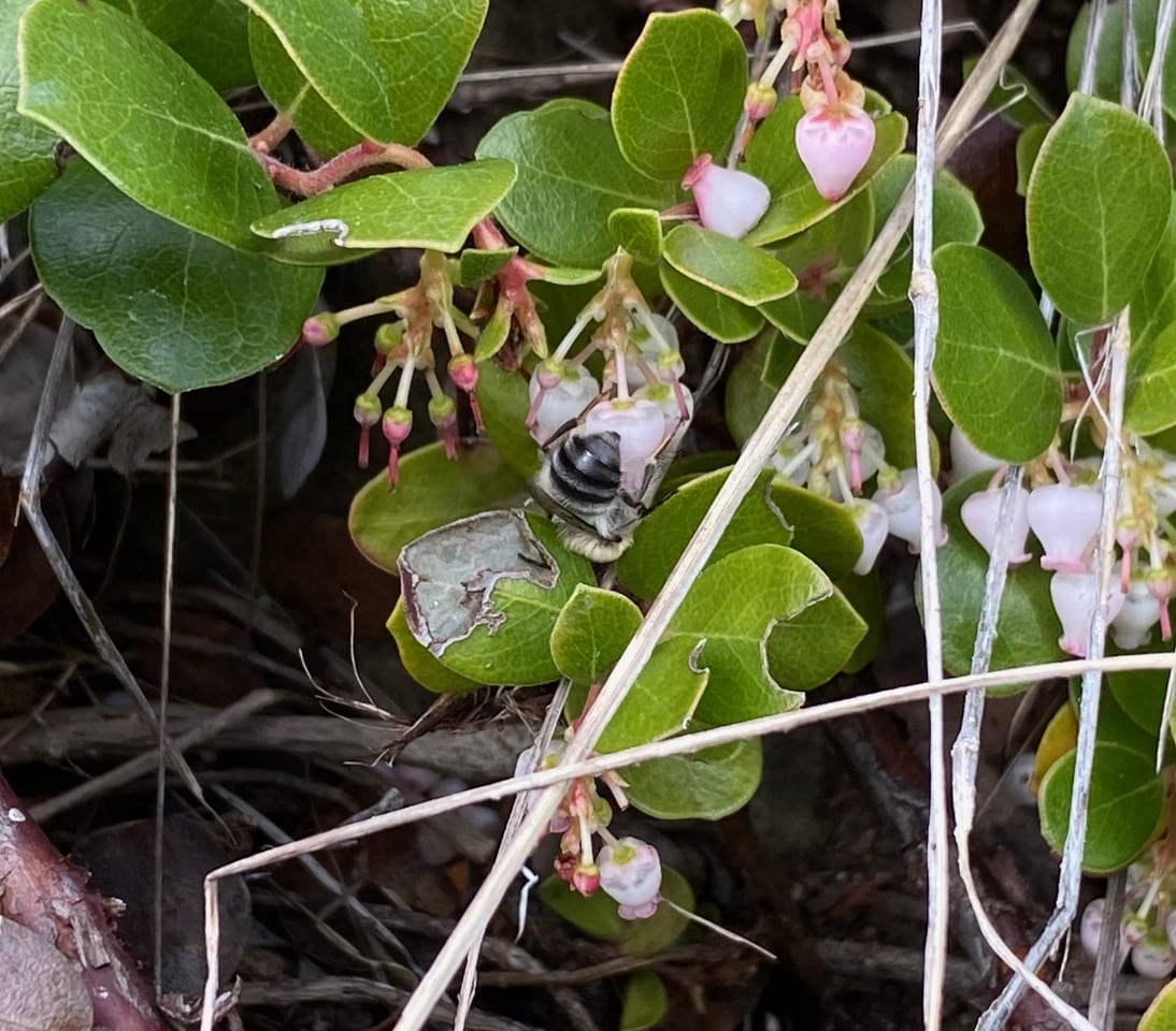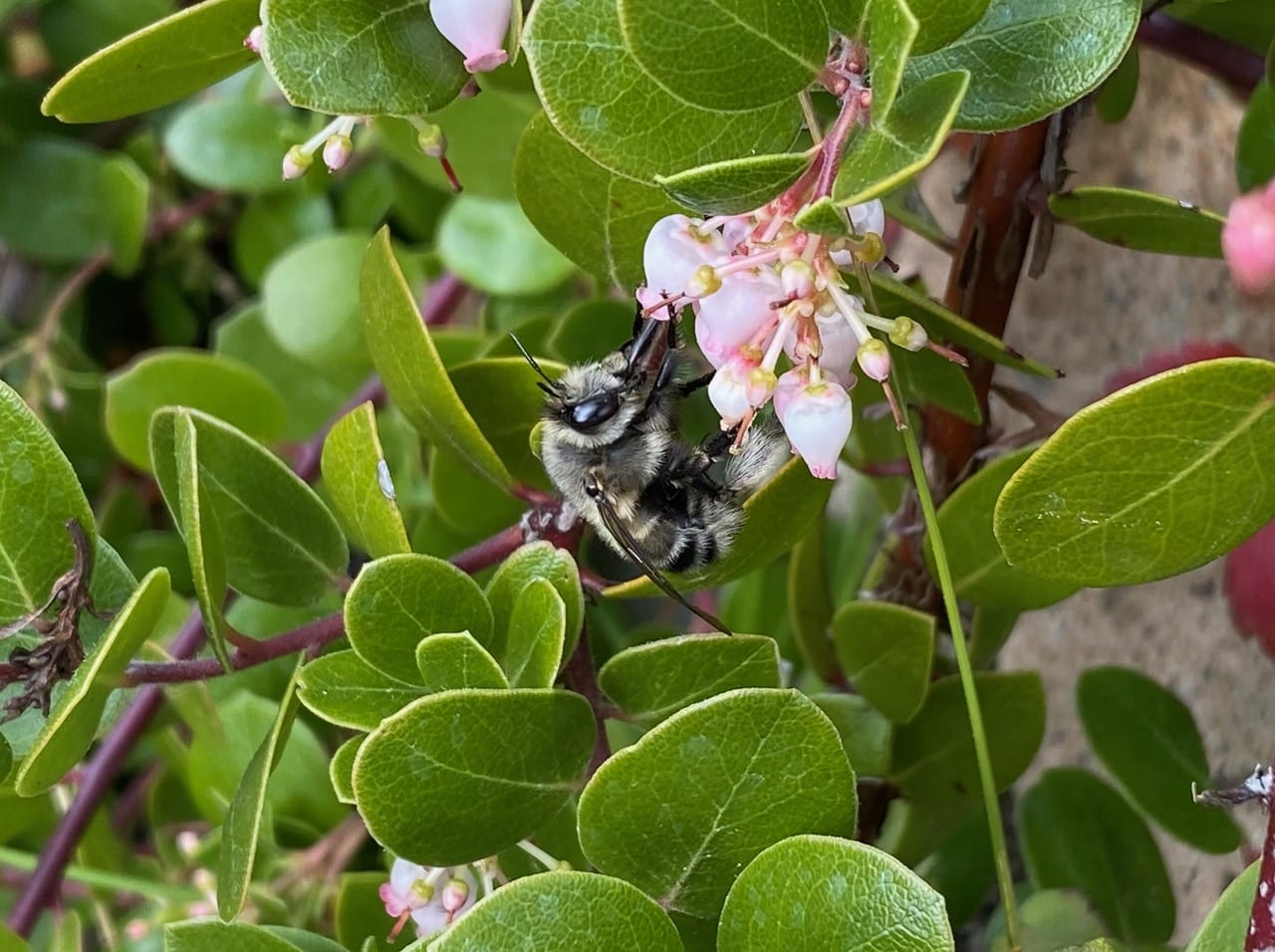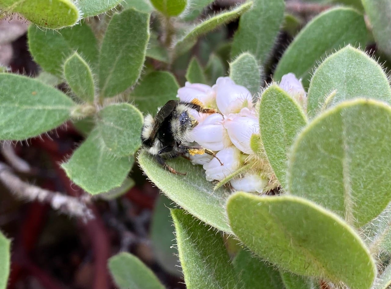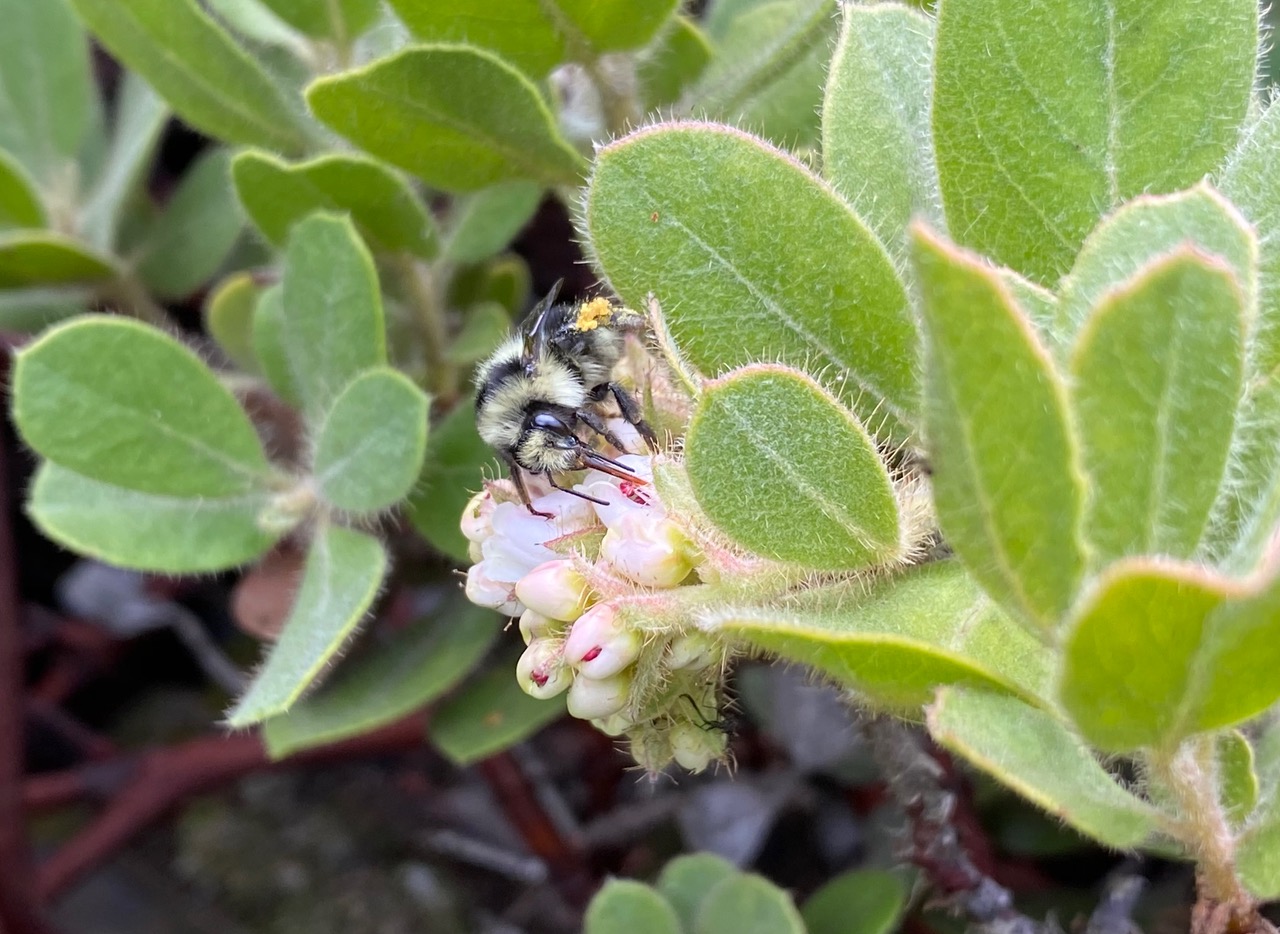 A large Yellow-faced Bumble Bee, subgenus Pyrobombus (genus Bombus, family Apidae) lands on a manzanita. Wow, I haven’t seen a queen out foraging for a while. Most visiting the flowers now are small workers.