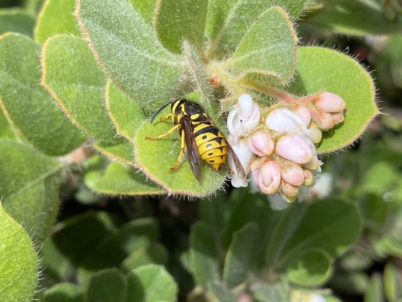 Whoa, that’s the biggest and fattest Yellowjacket I have ever seen! Antennae droopy and body relaxed, the wasp seems to be taking a nap on the manzanita leaf. Given its size it has to be a queen. Yellowjacket queen stands out by its larger size. The workers have a body length of 16-18 mm (1/2 in.), while the queens grow to 20-25 mm (3/4 in.) Why is the queen out of hibernation so early? Has she emerged prematurely from her winter rest, fooled by the unusually warm weather we have? iNaturalist has helped identify the wasp as a Common Aerial Yellowjacket, Dolichovespula arenaria (family Vespidae).