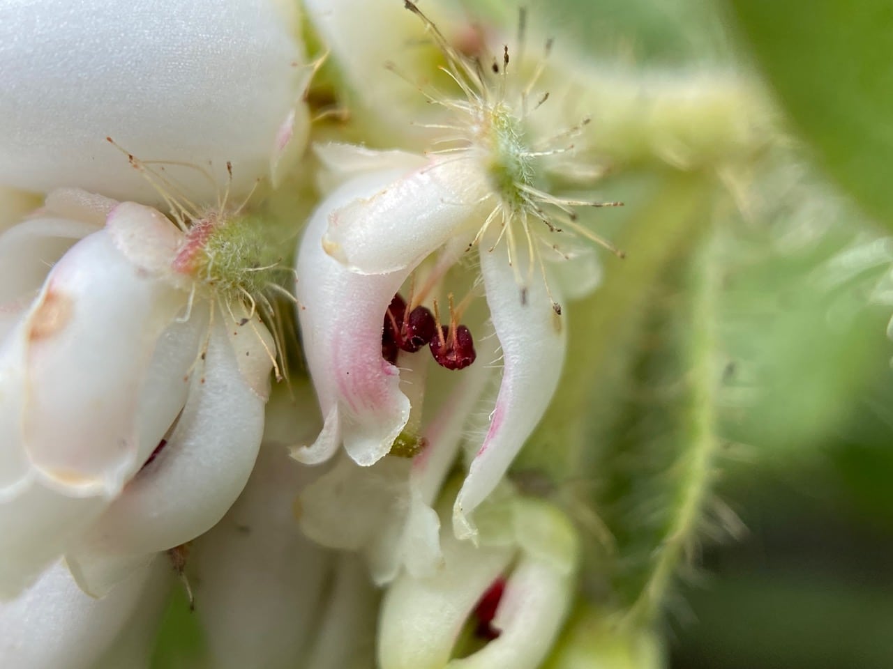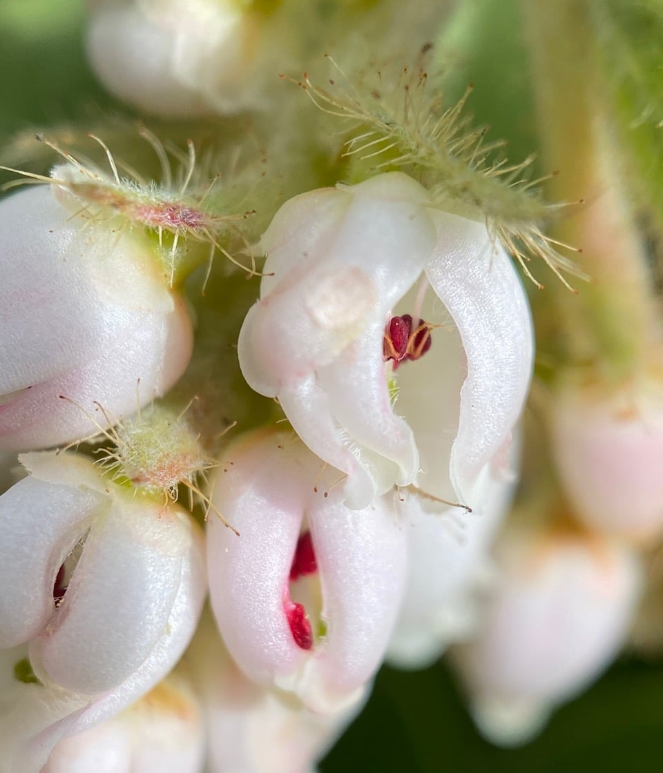 Here’s a view of the unusual anthers of manzanita flower. Each filament holds a pair of ‘poricidal’ anthers with openings or pores at the tips. What’s more, a pair of antler-like appendages extend from the back of the anther to make contact with the corolla.