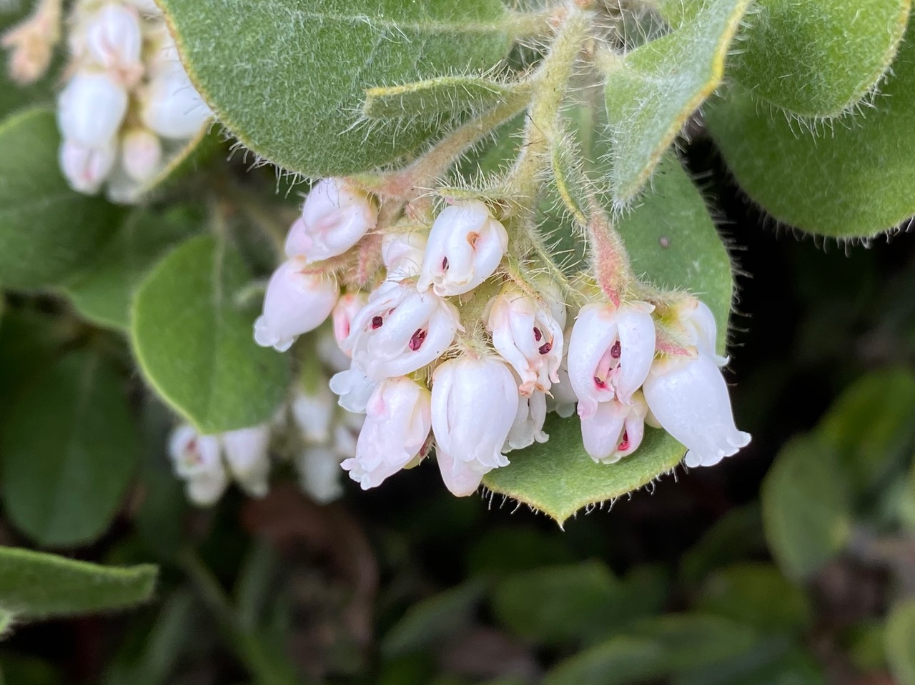 After the bee has left, I take a close look at the flowers of this mutant (?) manzanita. Interestingly the petals have not fused completely to form a closed urn-shaped corolla, but instead have remain partially separate. The reproductive structures can be seen through the gaps. Note the red anthers.