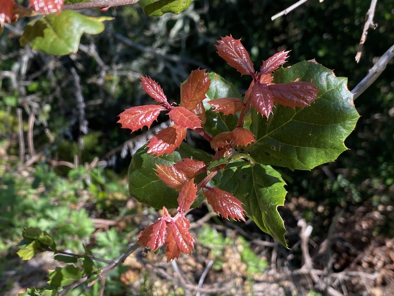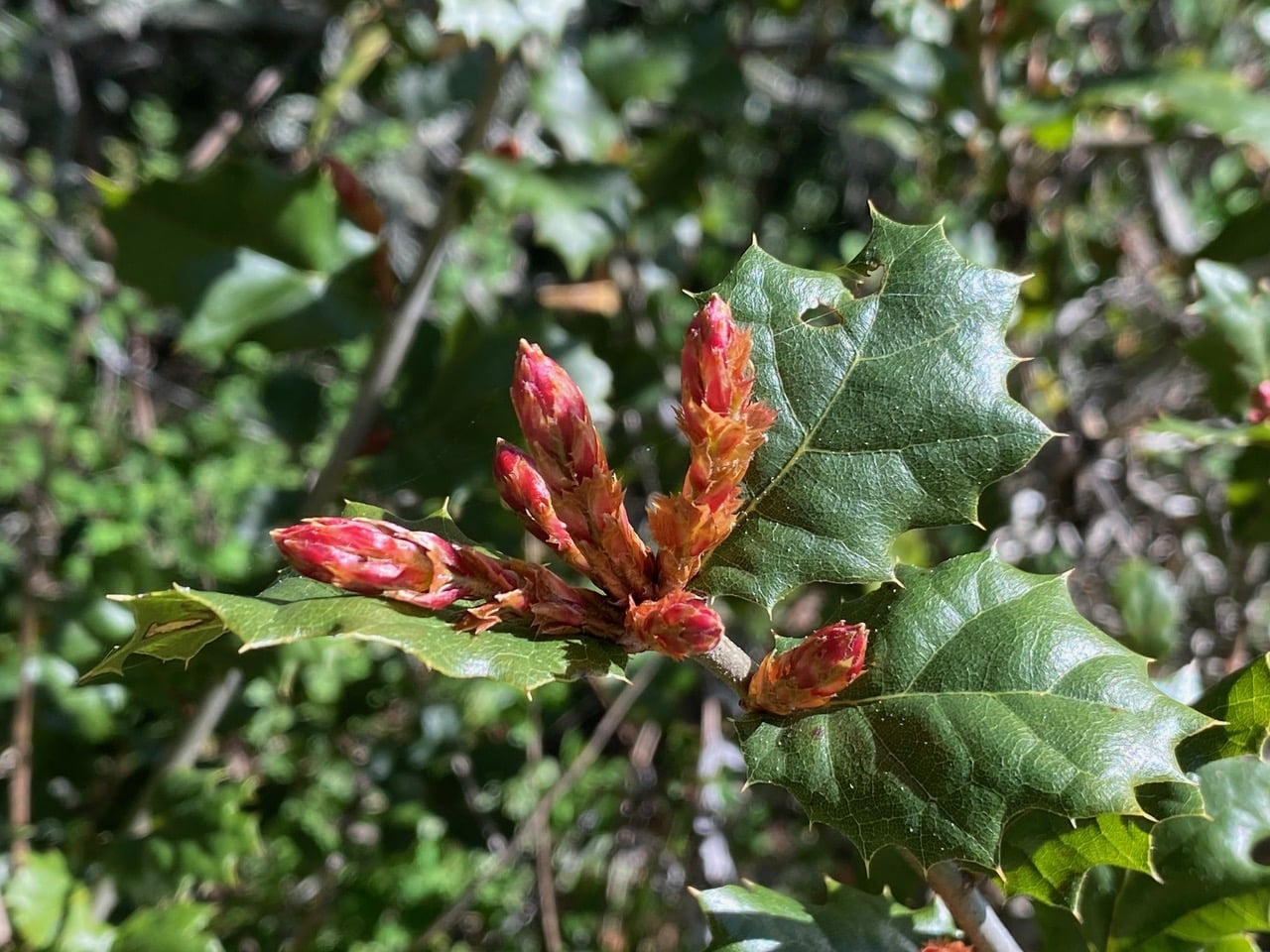 Out in full sun, the branch tips of a Coast Live Oak, Quercus agrifolia have put out new leaf buds