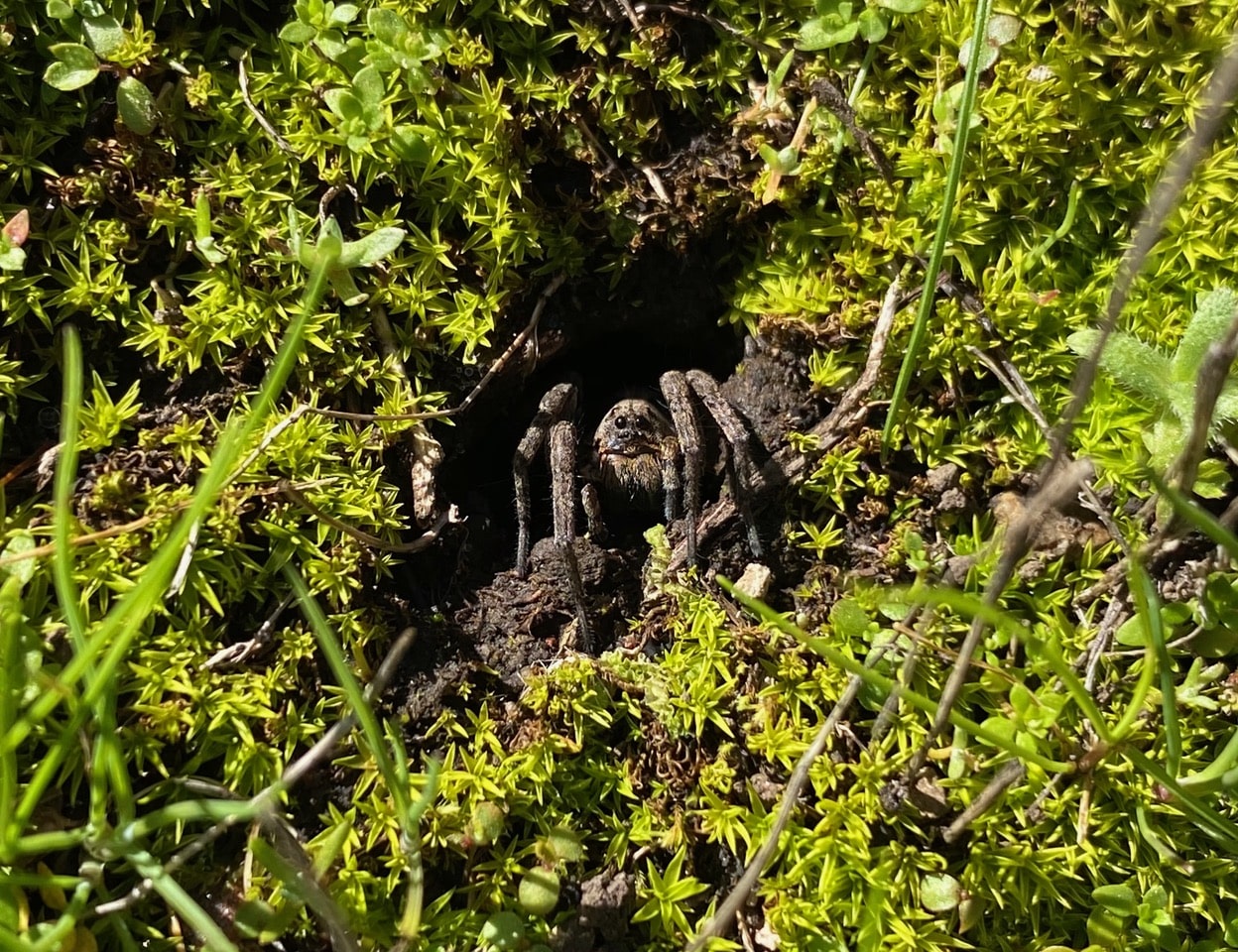 While photographing the liverworts, I detect a swift movement from the corner of my eyes. Not sure where that came from, I scan the surrounding moss-covered patch. Suddenly a spider appears from a hole. It hangs out at the entrance, seemingly curious about my presence. When I approach closer, it swiftly vanishes into the hole. This happens several times, a comical hide-and-seek game spurred by mutual curiosity. The hole, a little less than the diameter of a dime, is irregular in shape, and lacks silk lining. I don’t think it is constructed by the spider, but is simply a crack in the ground that the spider is using as a temporary hiding place.