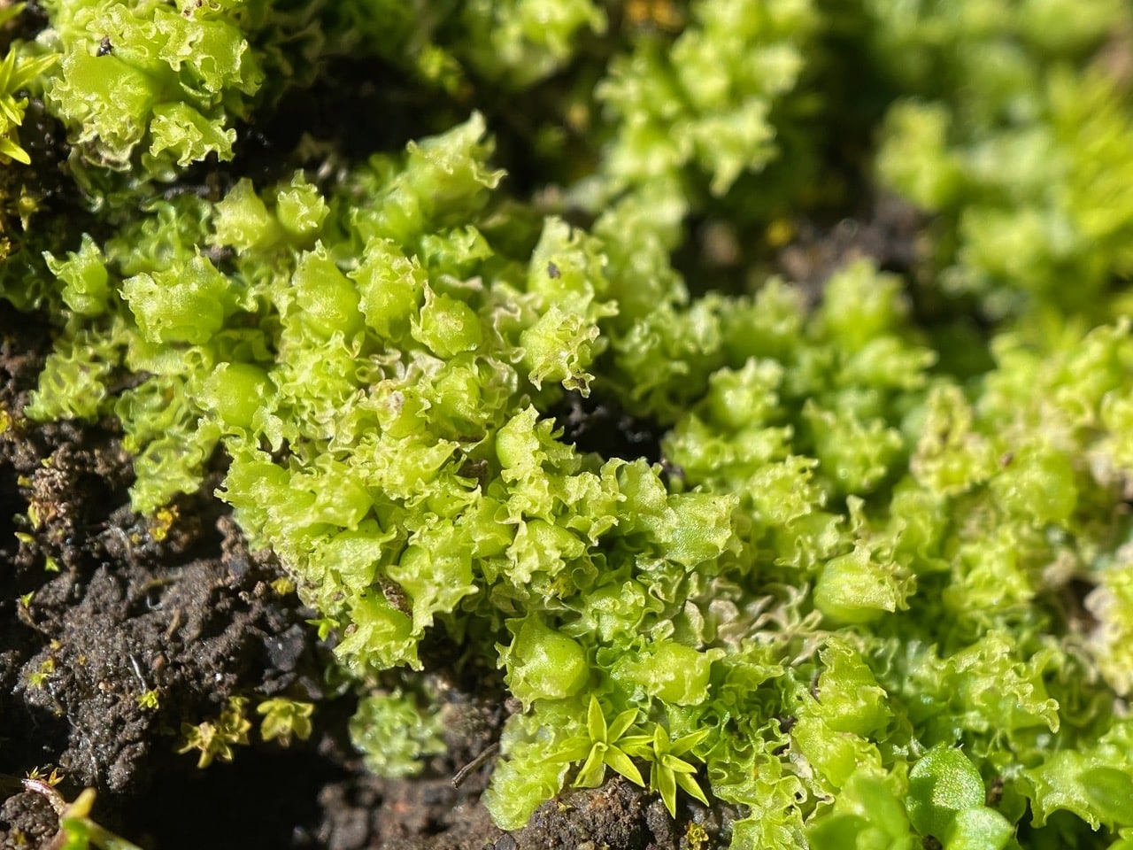 Liverworts, together with mosses and hornworts, are collectively known as Bryophytes. They are non-vascular plants, which means they have no roots or vascular tissue, but instead absorb water and nutrients from the air through their surface (e.g. their leaves). Most of them only grow a few centimeters in height, and since they don’t need roots, they can grow on the surface of rocks, walls, pavement, etc. Bryophytes thrive in damp, shady environments, but they can also be found in diverse and even extreme habitats, from desert to arctic areas. Unlike flowering plants, bryophytes reproduce by spores instead of seeds. Bryophytes play an important role in the environment. They colonize sterile soils, absorb nutrients and water and release them slowly back into the ecosystem, contributing to the formation of soil for new plants to grow on.