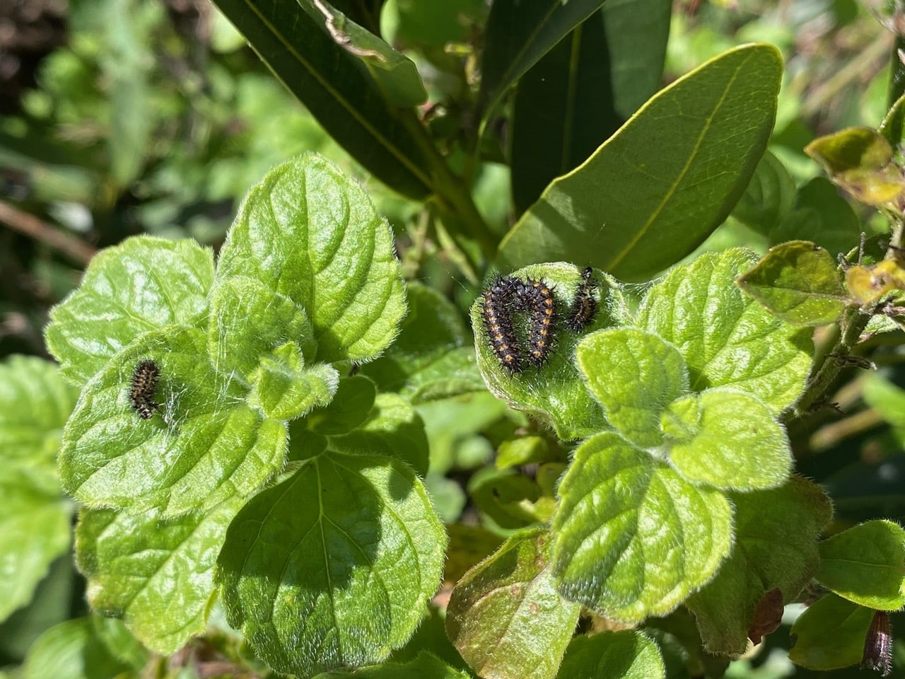 Surprise! What are these Variable Checkerspot caterpillars doing on the leaves of Calamint, Clinopodium sp.? The plant is next to a badly chewed Bee Plant. Perhaps the caterpillars have moved over because of overcrowding, and to look for fresh sources of food? Note that these small caterpillars have woven a mesh of silk around themselves. There are only two caterpillars in this view, the smaller fuzzy things are actually exuvia, the shed exoskeletons left behind after a molt.