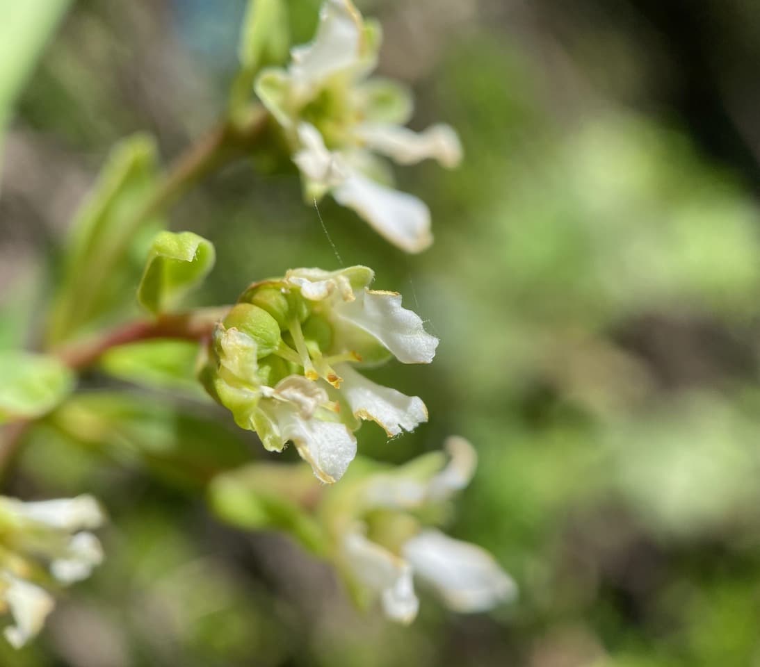 A petal has fallen off this fading Osoberry flower, revealing the developing ovaries under the styles.