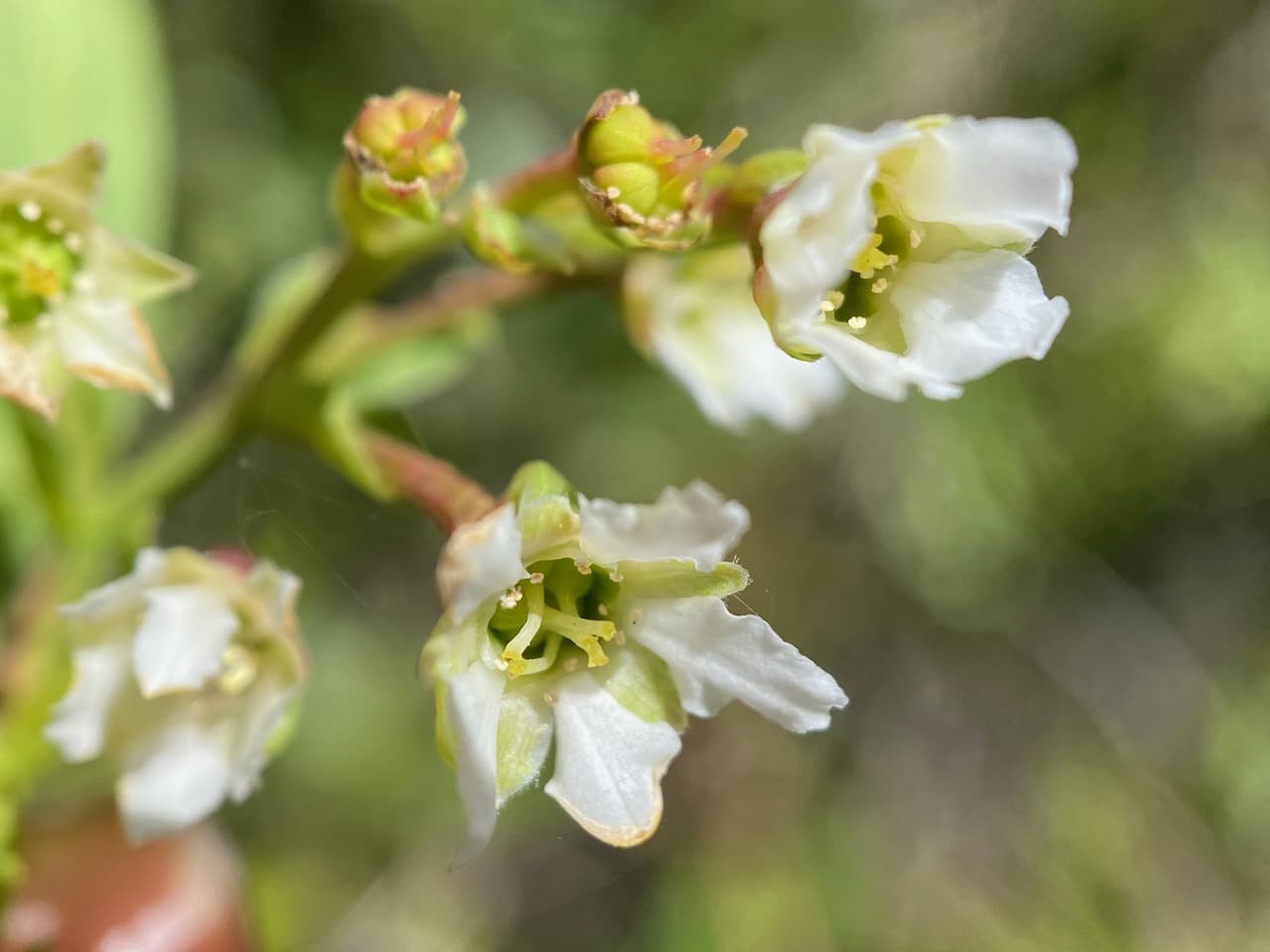The Osoberry, Oemleria cerasiformis is dioecious – male and female flowers are borne on separate plants. There are 5 petals and 5 sepals. There are numerous stamens (15, to be exact), in 3 series in the tubular portion of the calyx. Male flowers have prominent stamens that produce prodigious pollen. Female flowers have shriveled, pollen-less stamens and prominent carpels consisting of five styles and five separate ovaries. When fertilized, the ovaries develop into drupes (stone fruits), the so-called “Indian Plums”, up to five per flower.