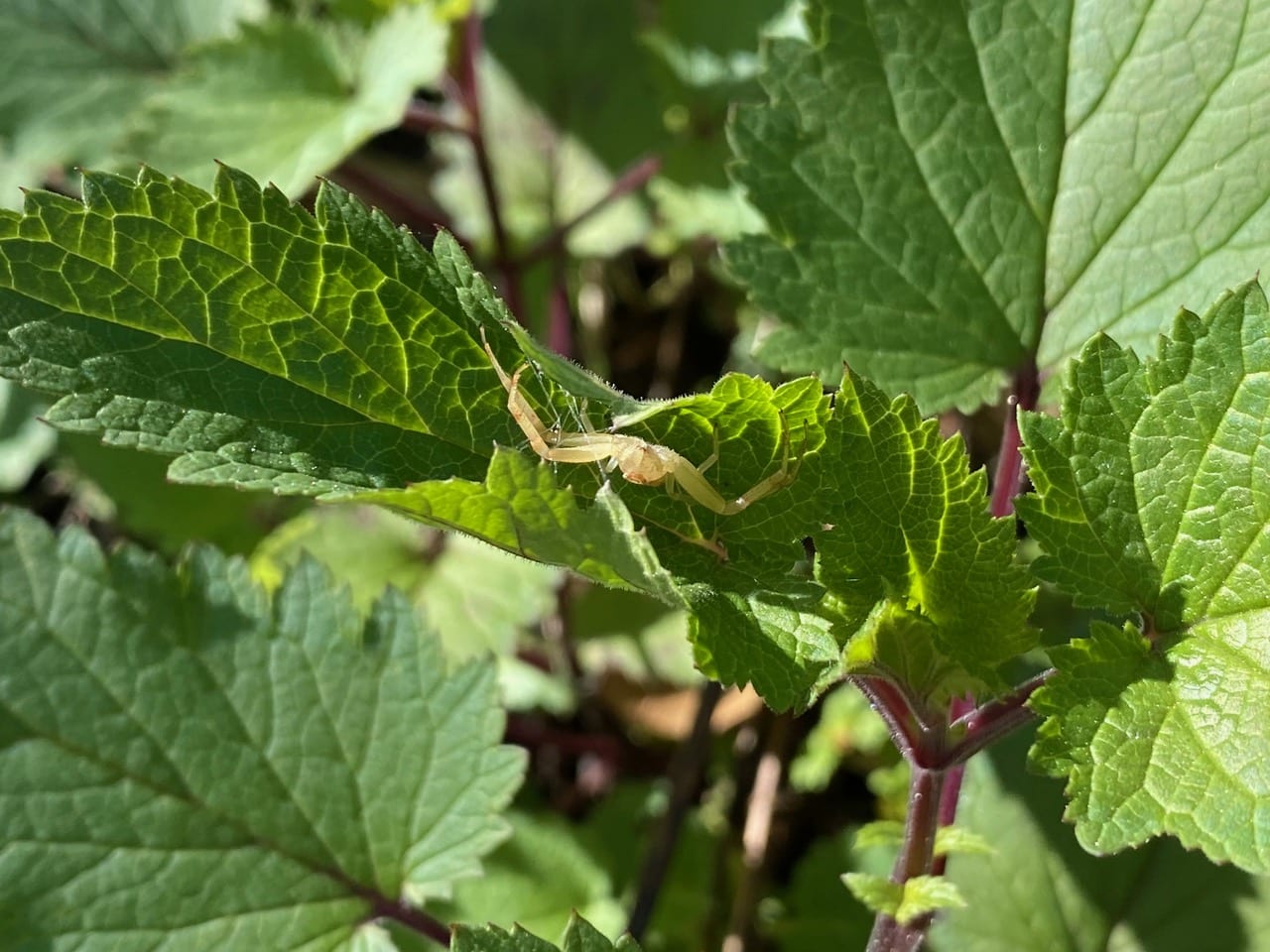 Look, there’s a Crab Spider (family Thomisidae) watching me upside down from that Bee Plant leaf! Did the spider partially fold the leaf with silk? Is that its retreat?