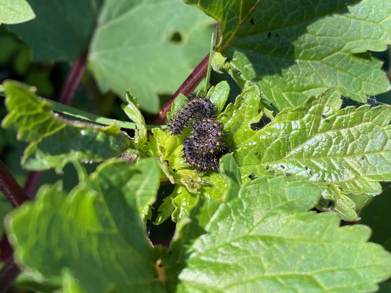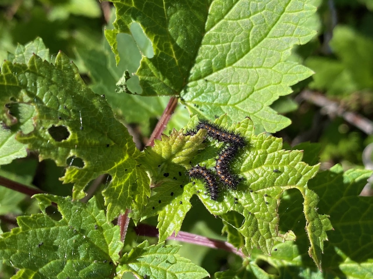 Wow, these leaves have been shredded by the caterpillars! Note the tiny pellets of frass (insect poop) that they have left on the leaves.