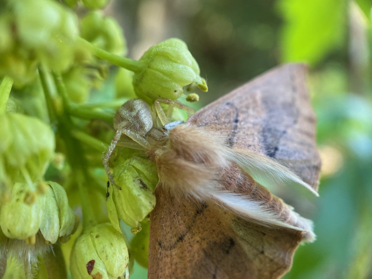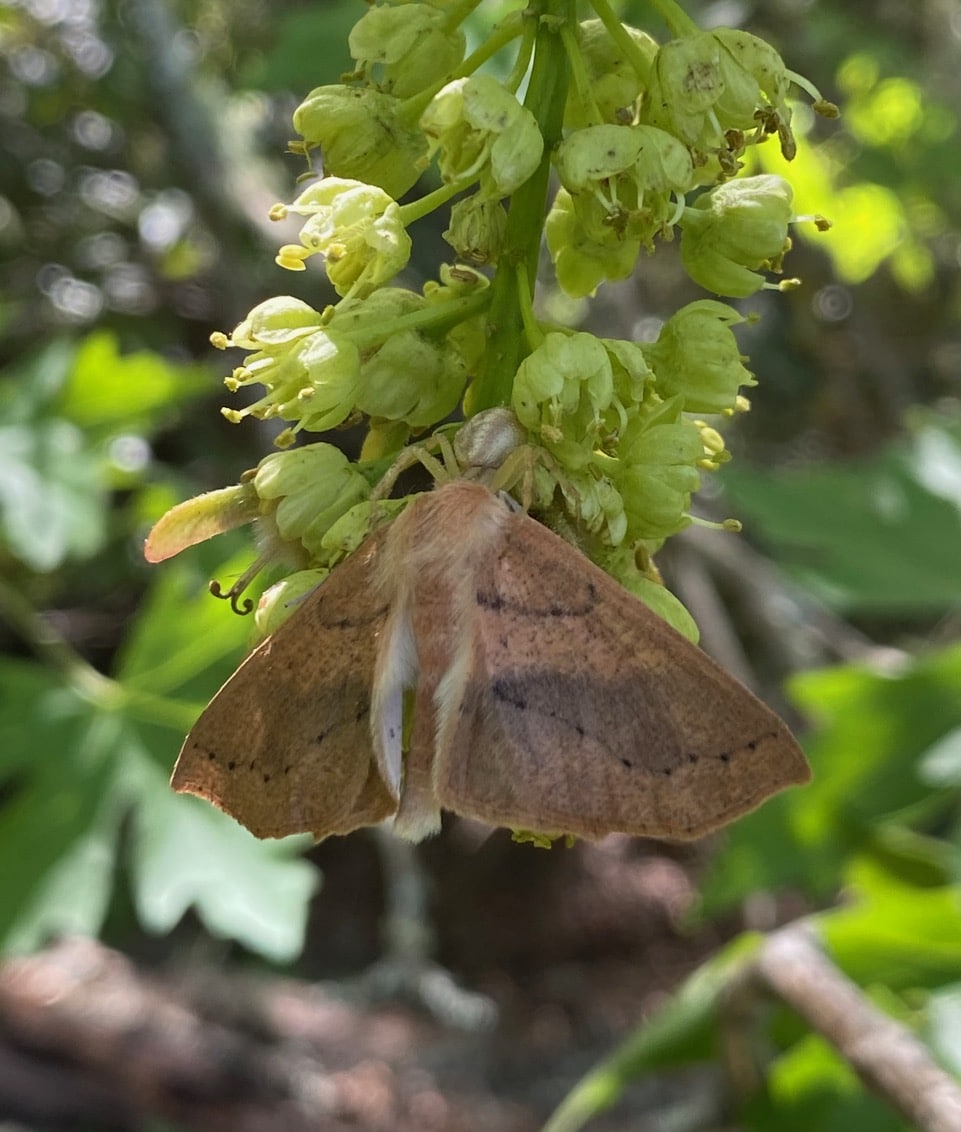 One last check on the moth and spider on the Bigleaf Maple flowers before I head home. Little has changed in 2 hours – it will take some time for the spider to finish its gigantic meal. Even then, the moth will still look the same, as Crab Spiders do not masticate their meals. They inject venom and digestive juices into their prey to digest it, then suck up the resulting liquified content through the same hollow fangs. Their prey is usually left intact in appearance, except for the pair of fang marks.