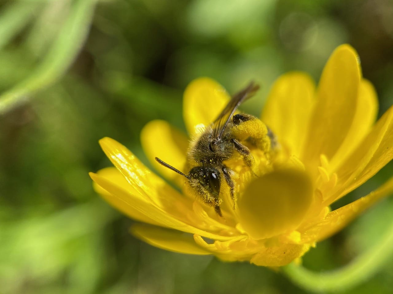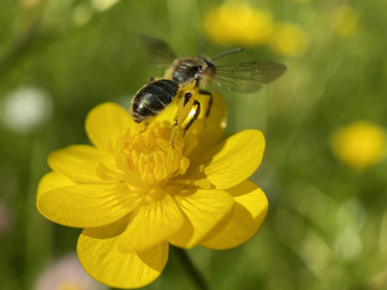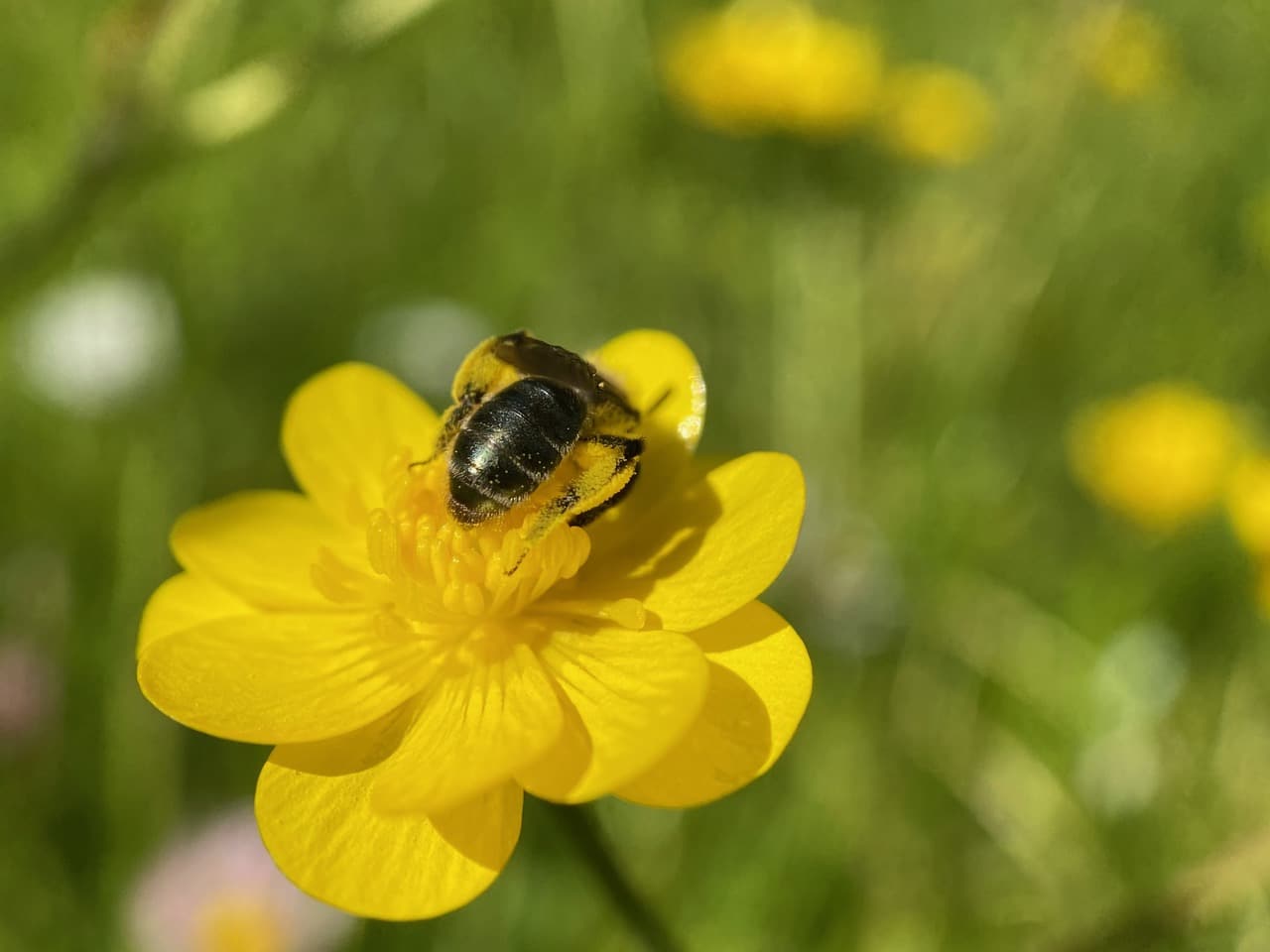In the process, the bees are covered with buttercup pollen.
