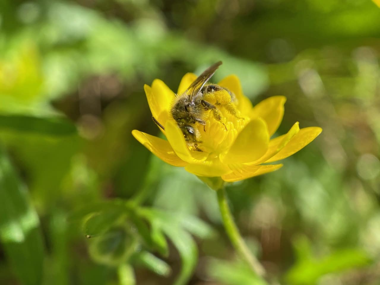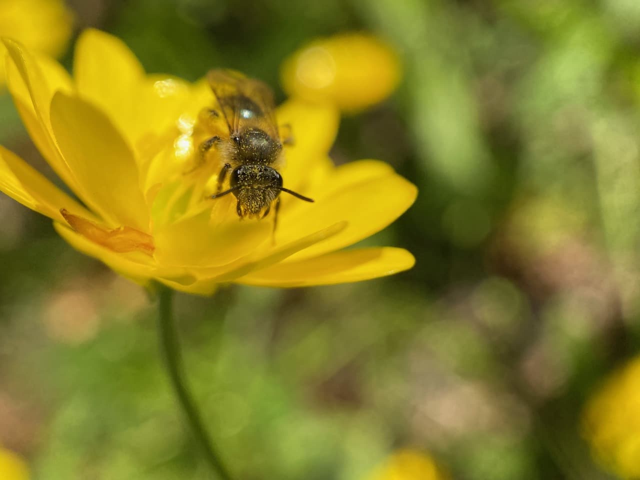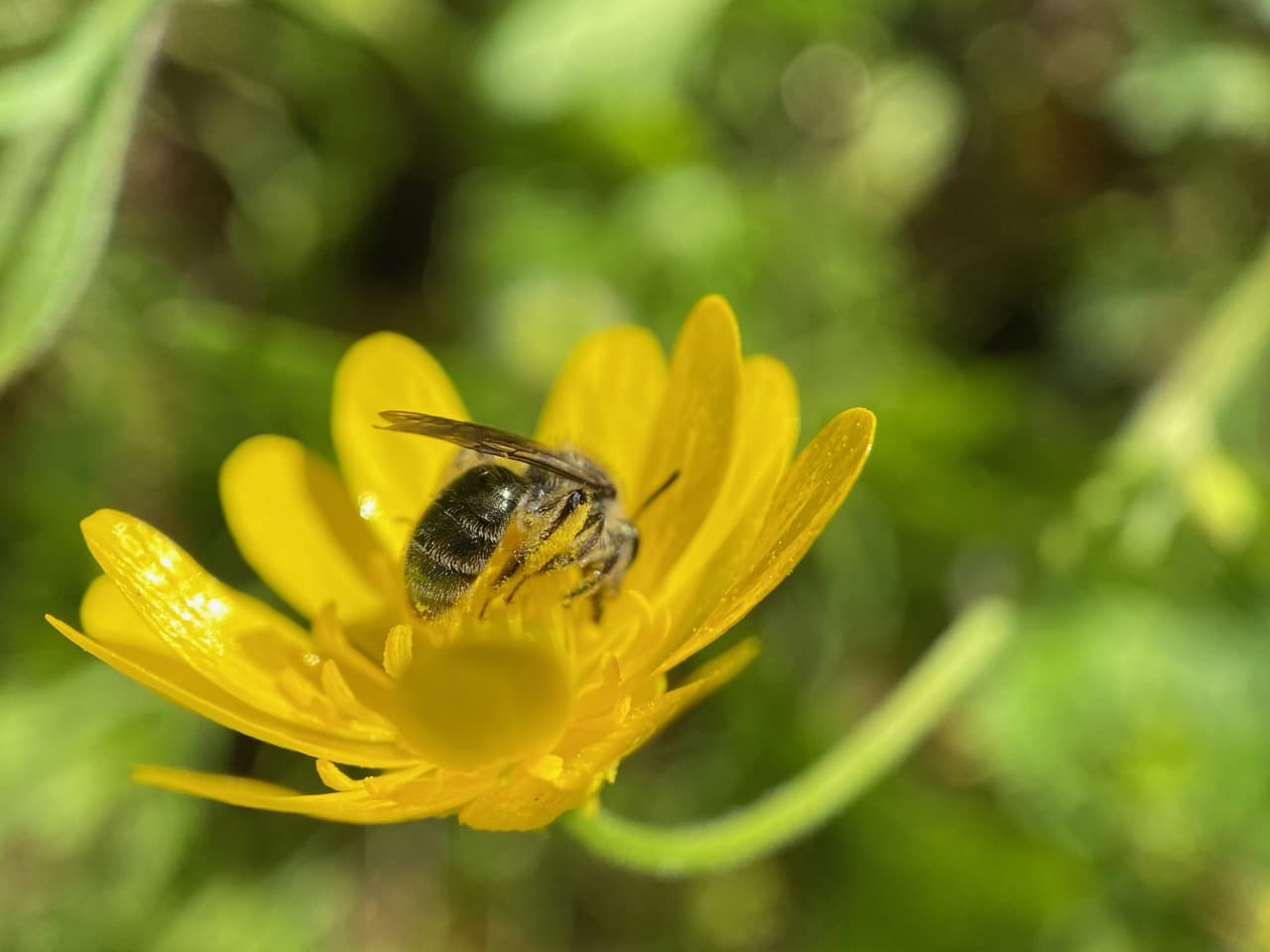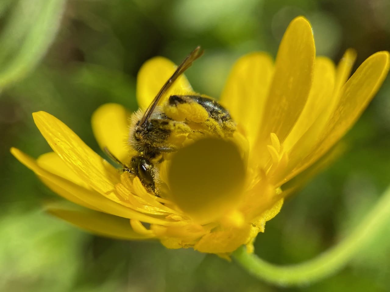 In the process, the bees are covered with buttercup pollen.