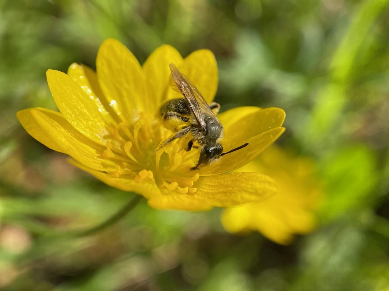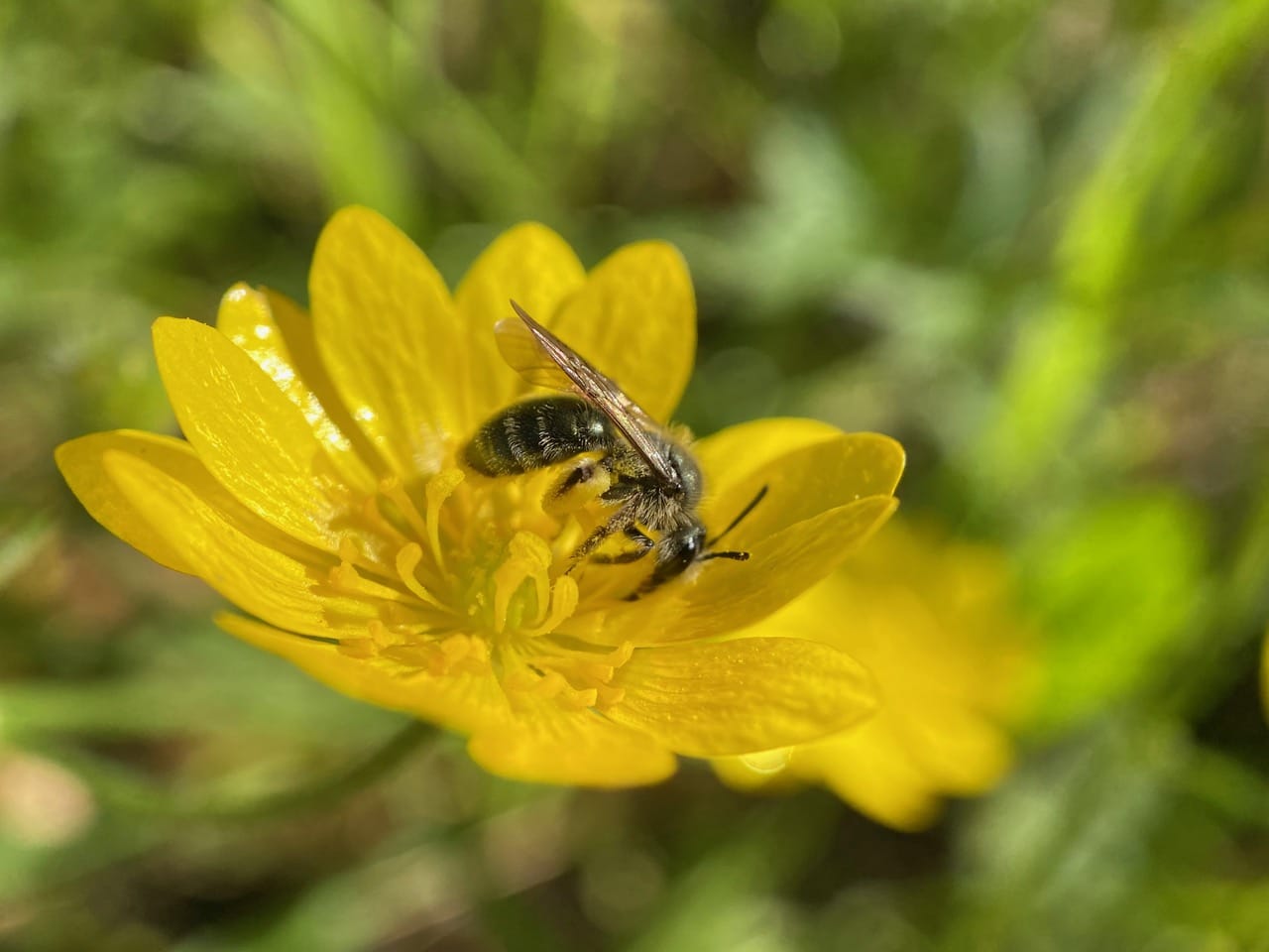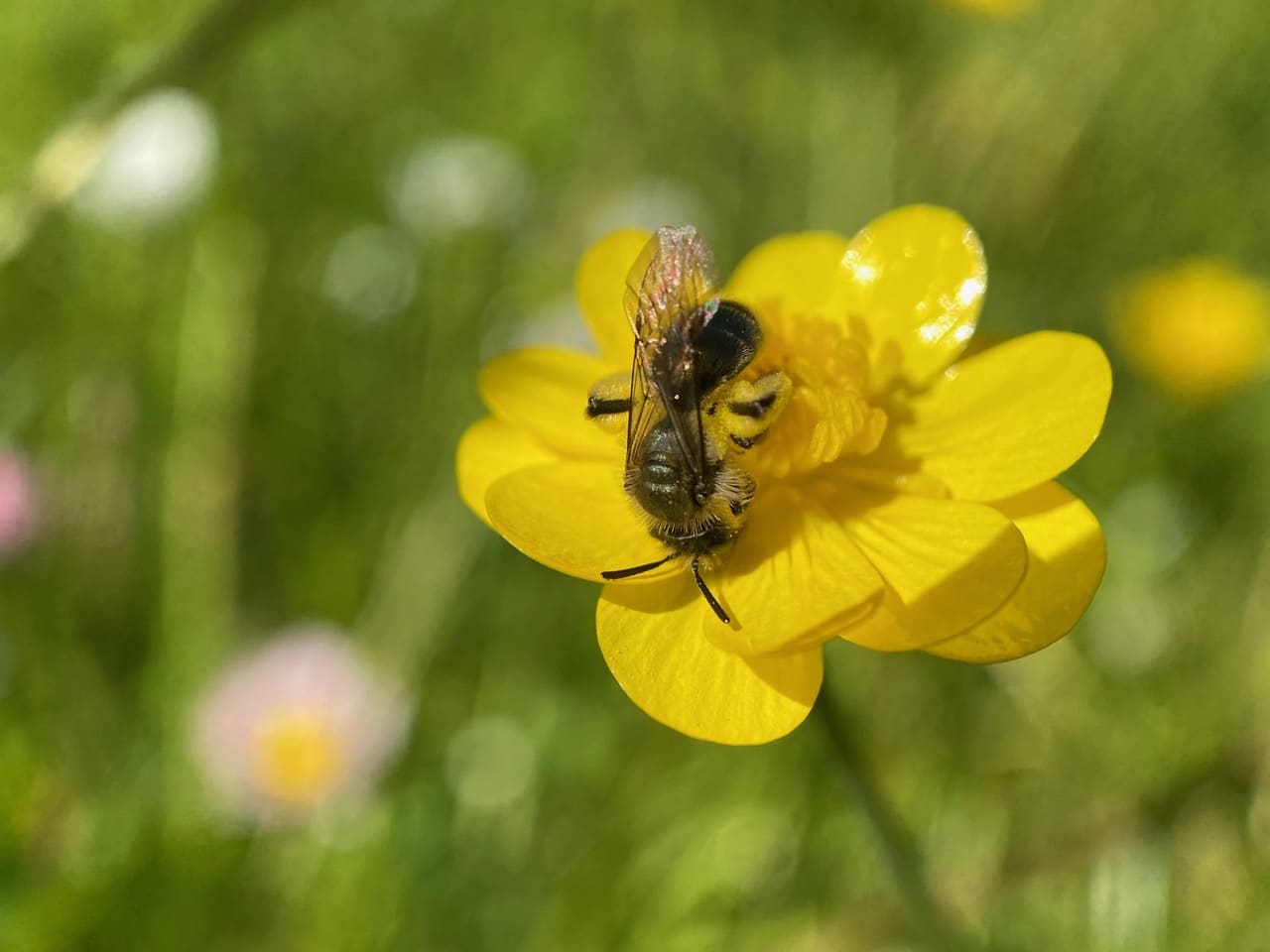 Ooh, that’s a different species of Mining Bee (family Andrenidae) on the buttercup flower. I think it is a male Golden-haired Miner Bee, Andrena auricoma, a generalist forager that visits a wide variety of flowers.