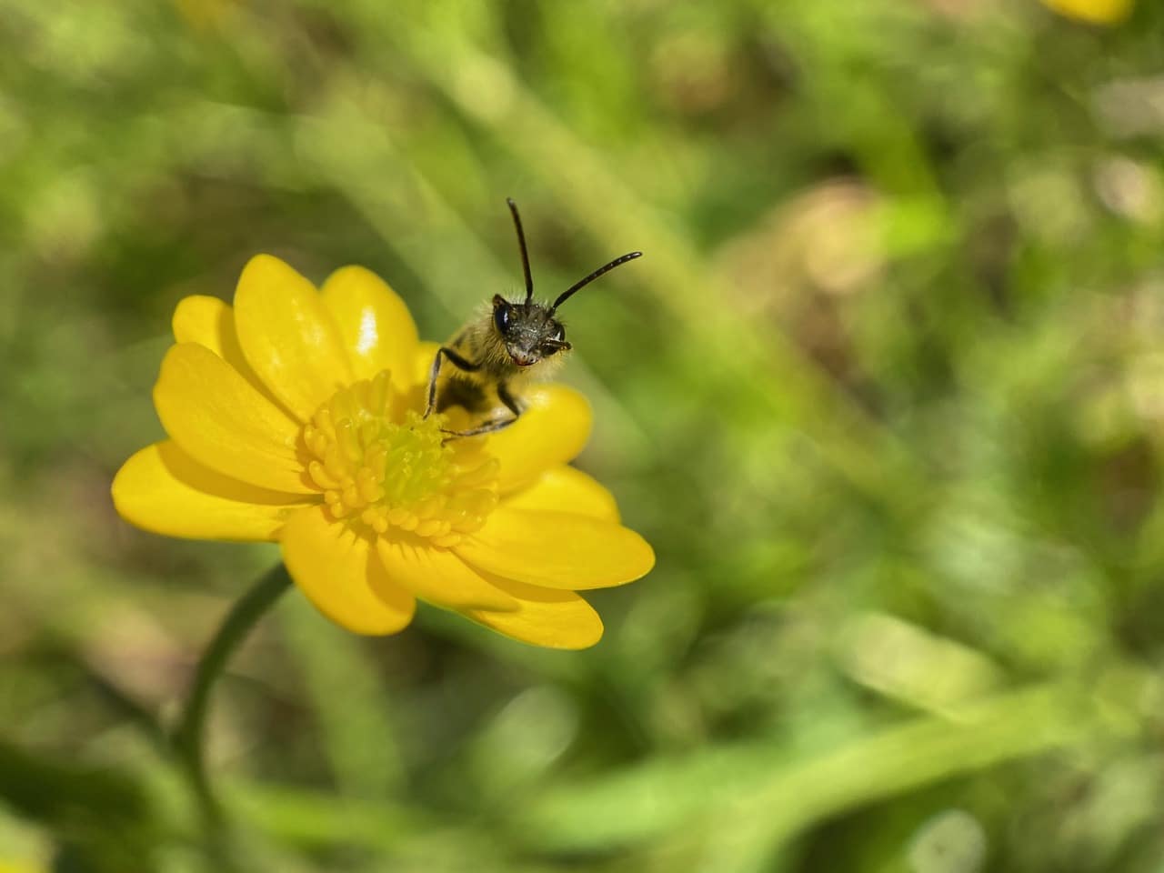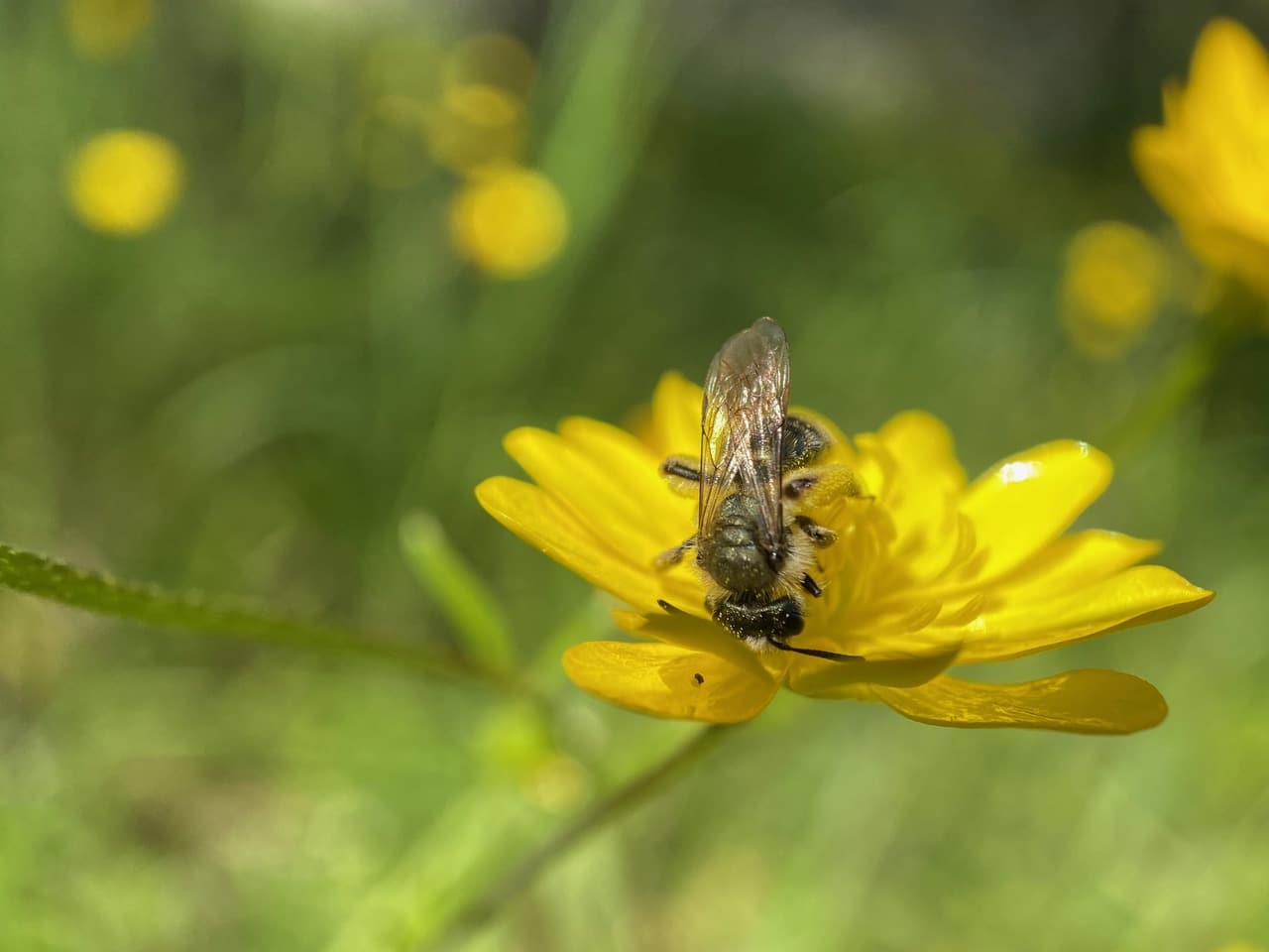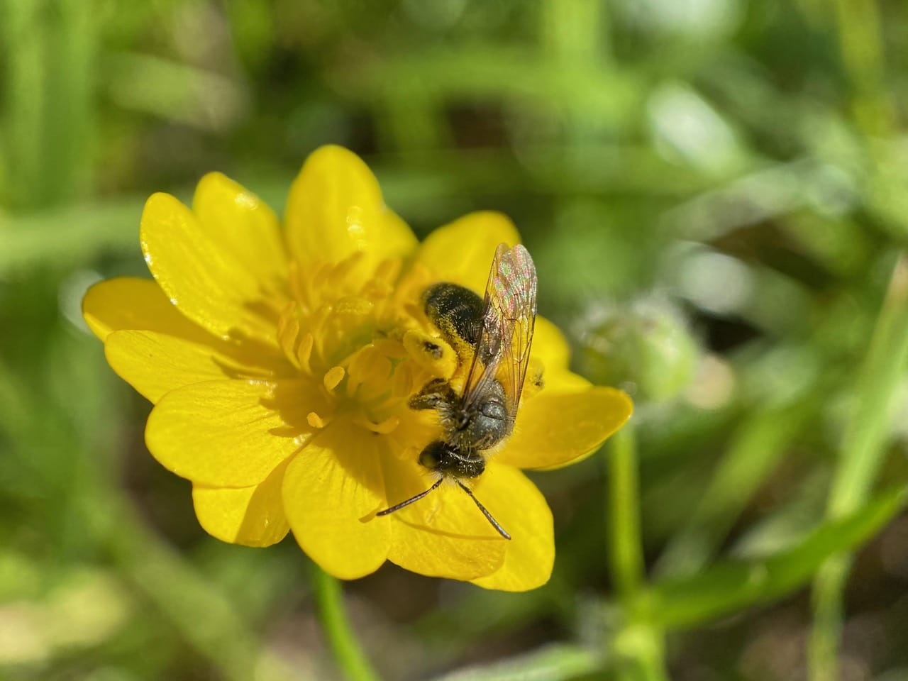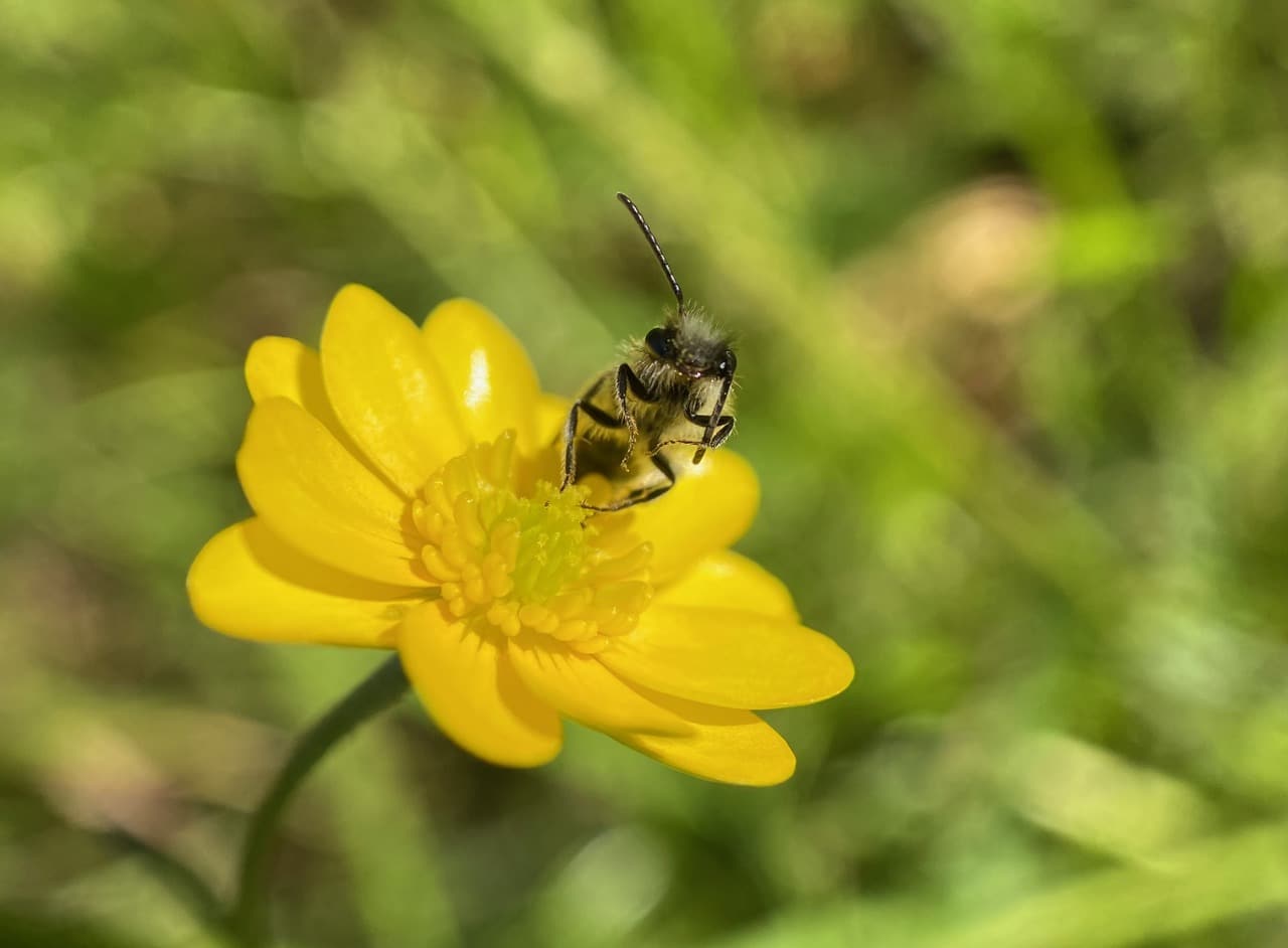Ooh, that’s a different species of Mining Bee (family Andrenidae) on the buttercup flower. I think it is a male Golden-haired Miner Bee, Andrena auricoma, a generalist forager that visits a wide variety of flowers.