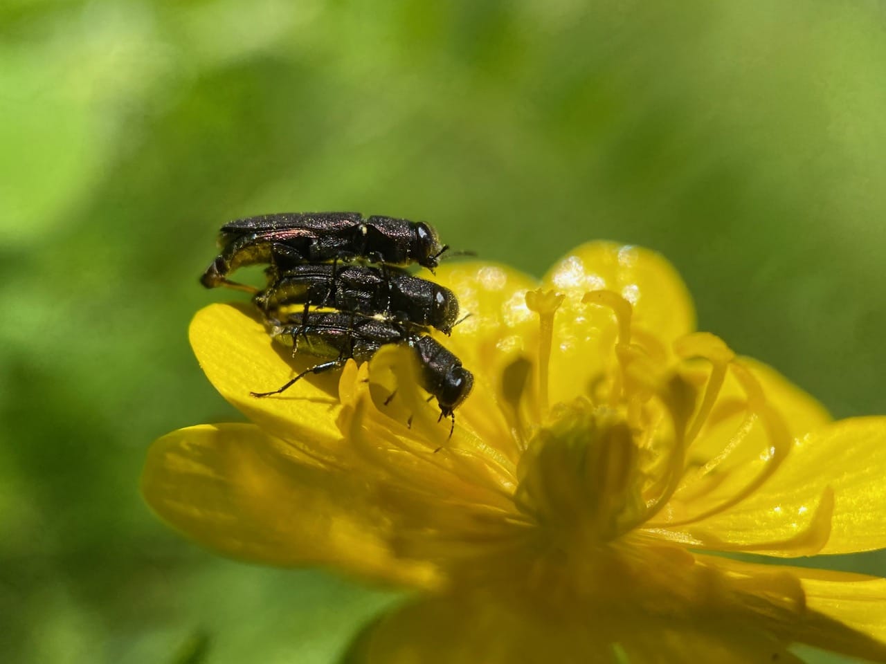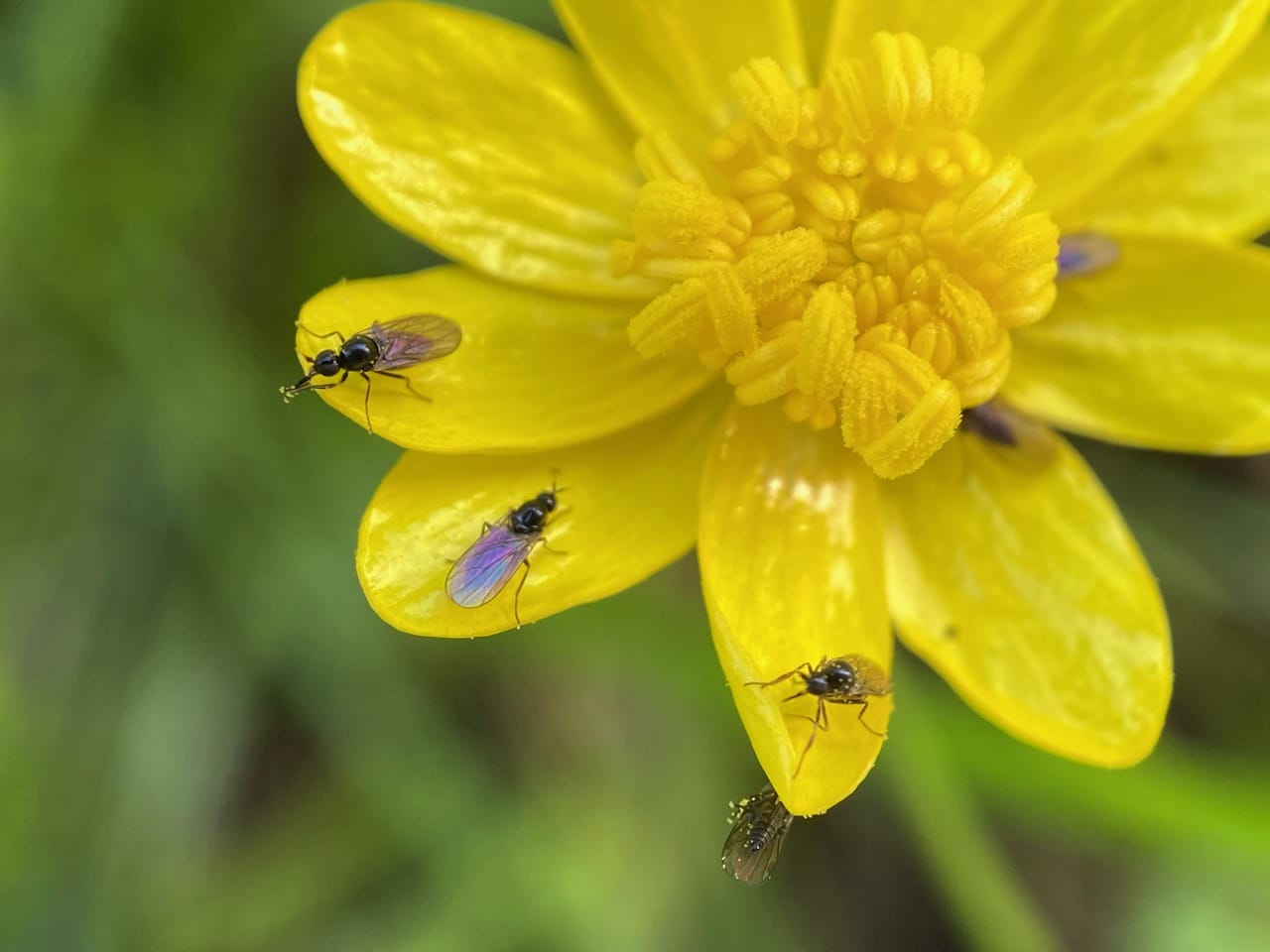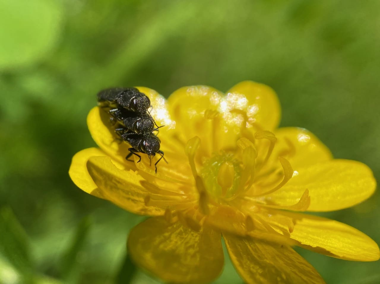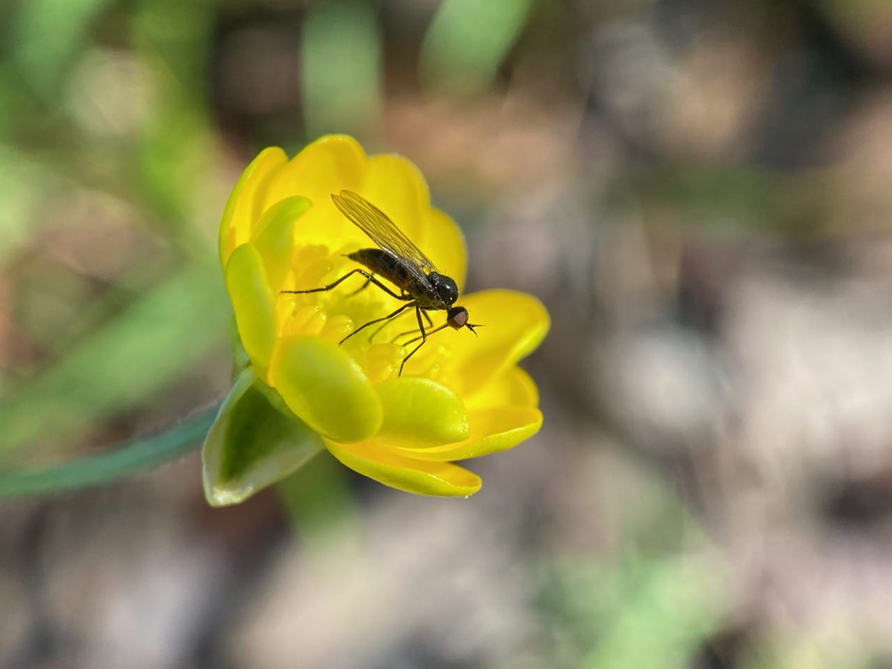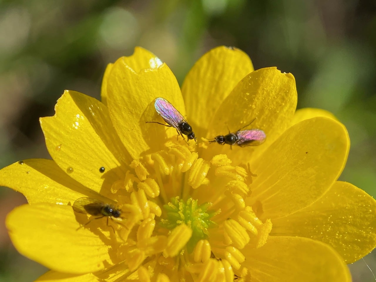 Every petal of this buttercup is occupied by a Hybotid Dance Fly (family Hybotidae).