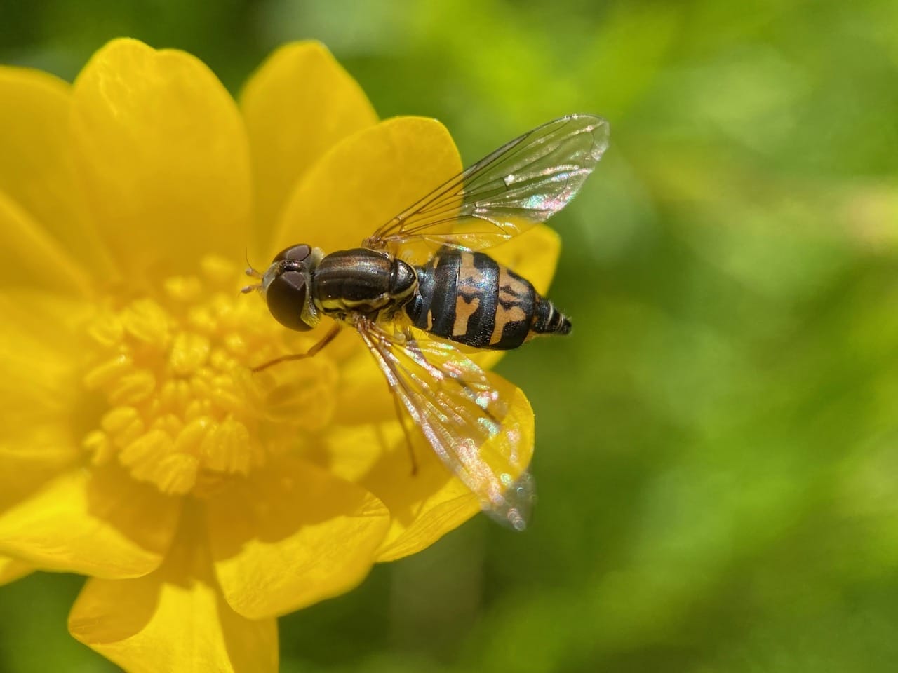 A female Western Calligrapher, Toxomerus occidentalis (family Syrphidae) visits a buttercup flower. These small hoverflies seem very fond of the buttercups, and can be found on the flowers early in the morning.