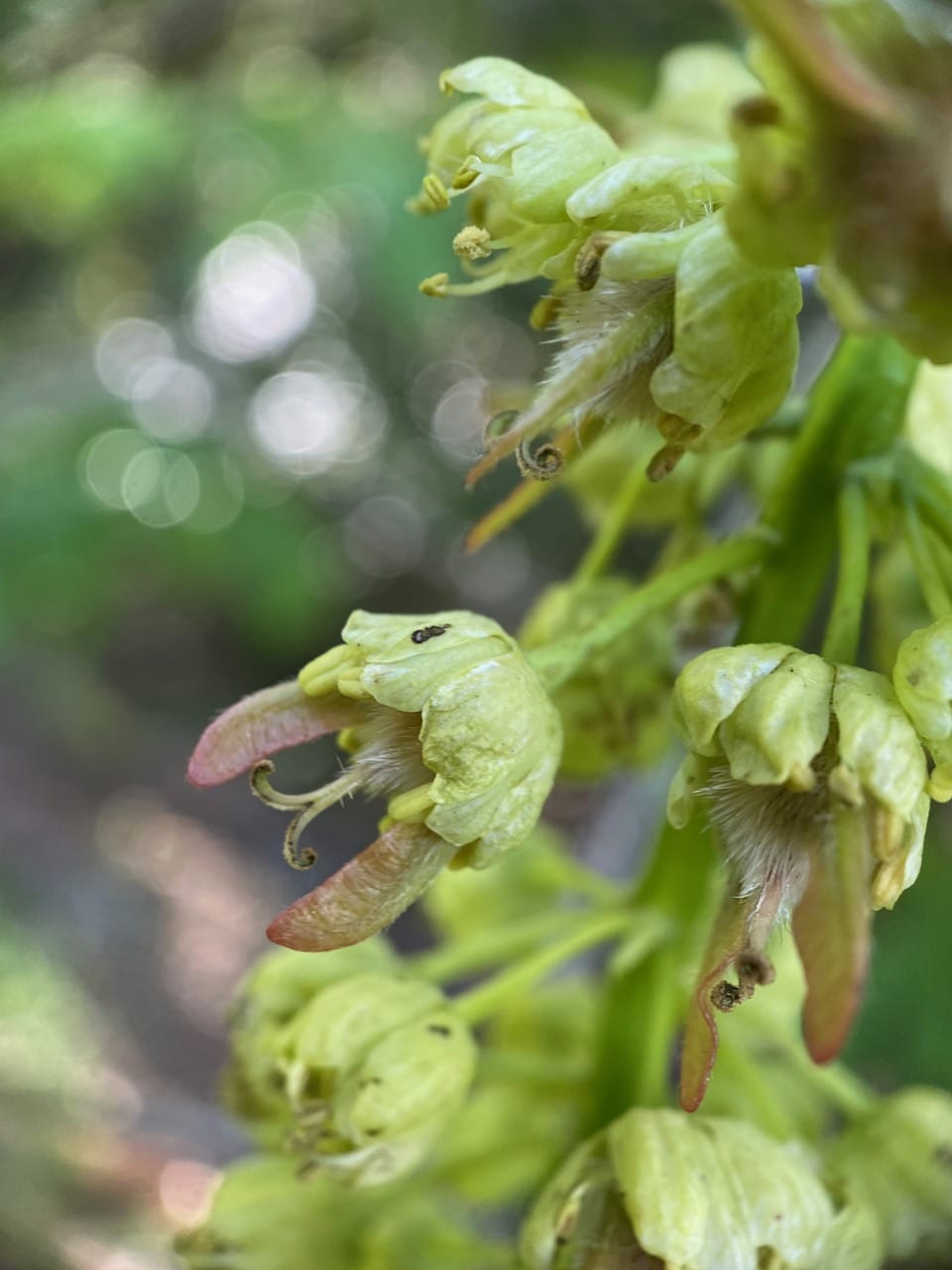 Bigleaf Maple, Acer macrophyllum thrives in wet forests and open fields. Flowers bloom in March through April before leaves appear. The tree is polygamous, bearing both male flowers and perfect flowers (with both male and female organs) in one cylindrical raceme. Ten stamens with globular, pollen covered anthers emerge from the cup-like corolla. The flowers are pollinated by insects within 2 to 4 weeks after bud-burst. The fruits are propeller-like, paired, winged samaras in the shape of a V. They emerge from the flowers looking like bunny ears popping out of a hole. Once fully developed in late summer, they travel like helicopters in the wind.